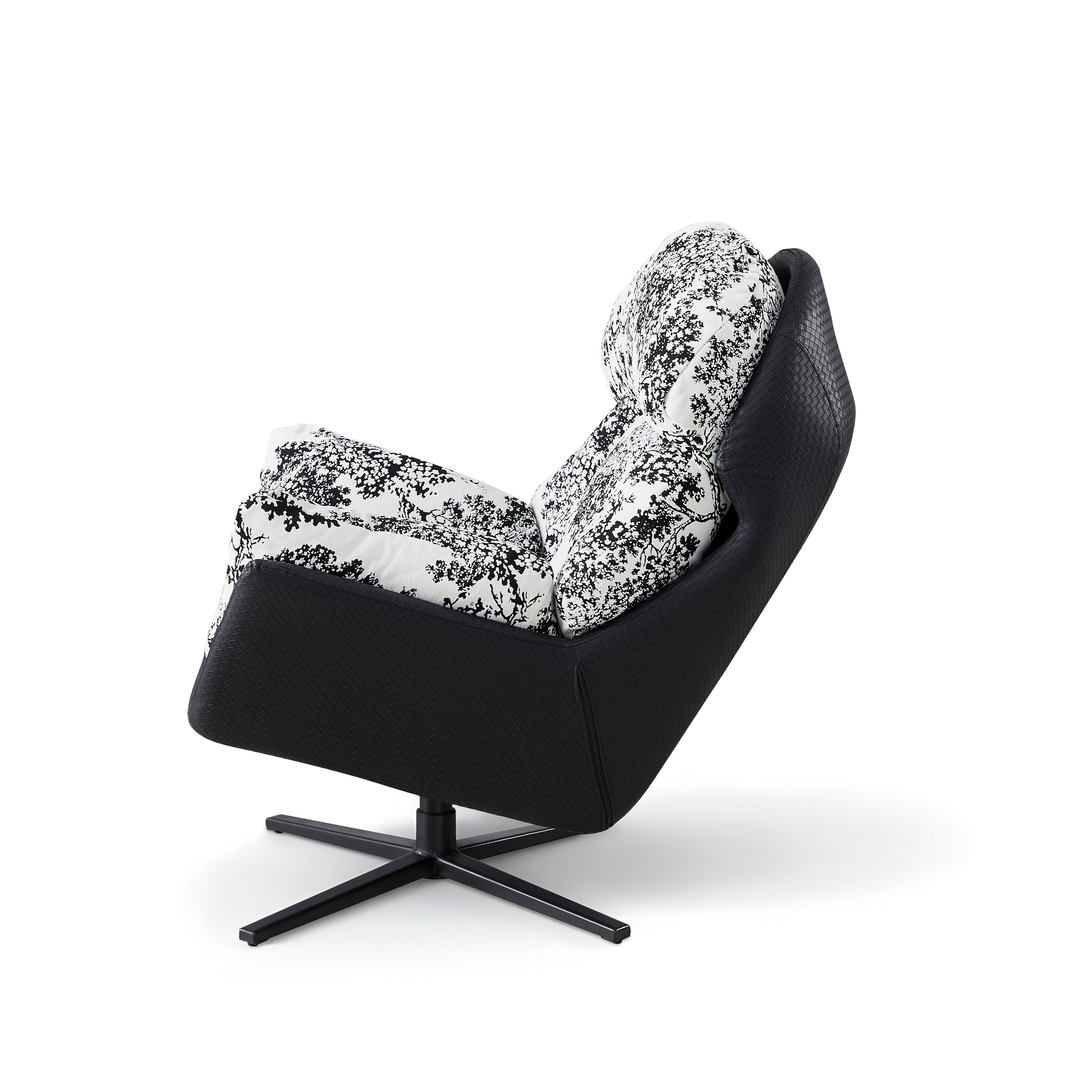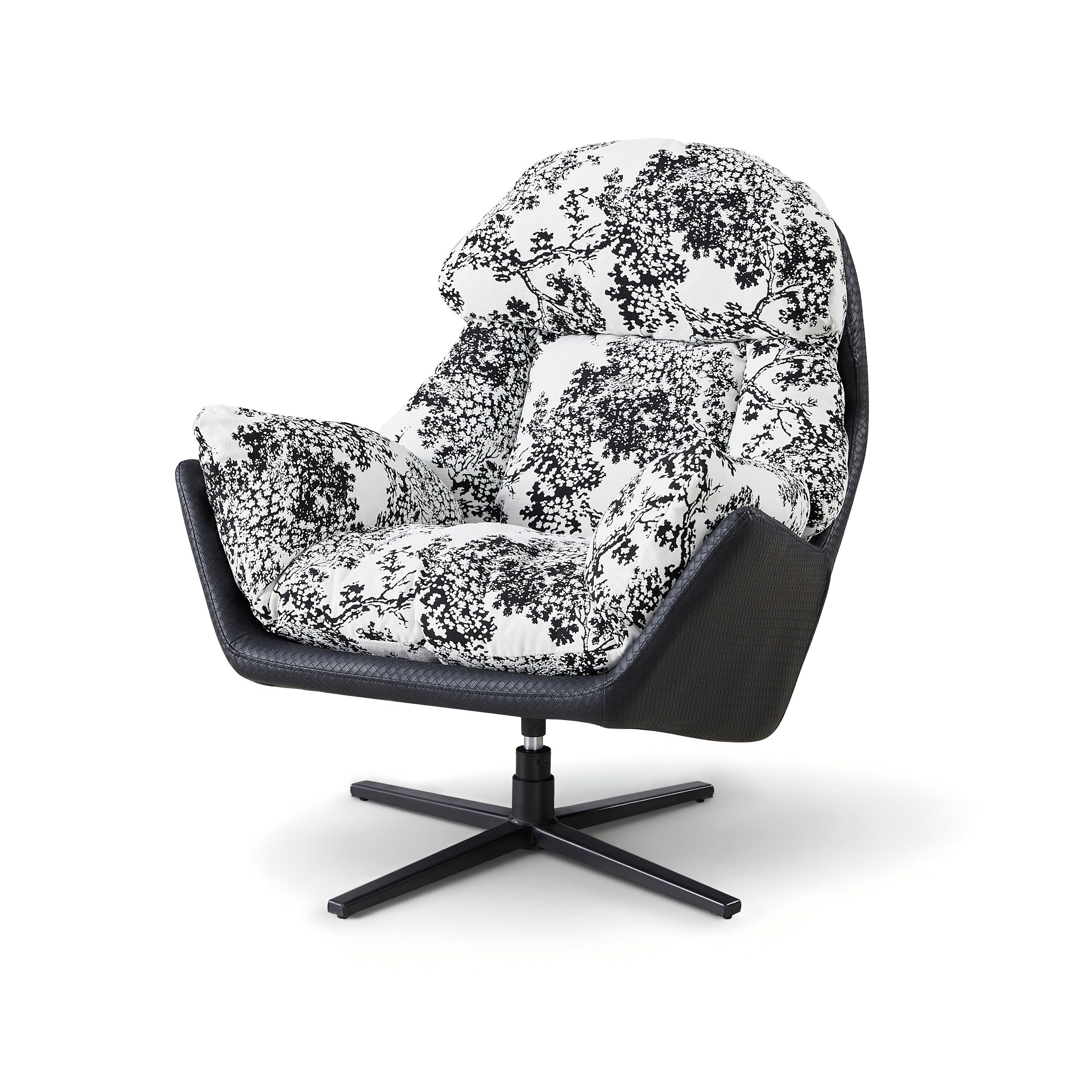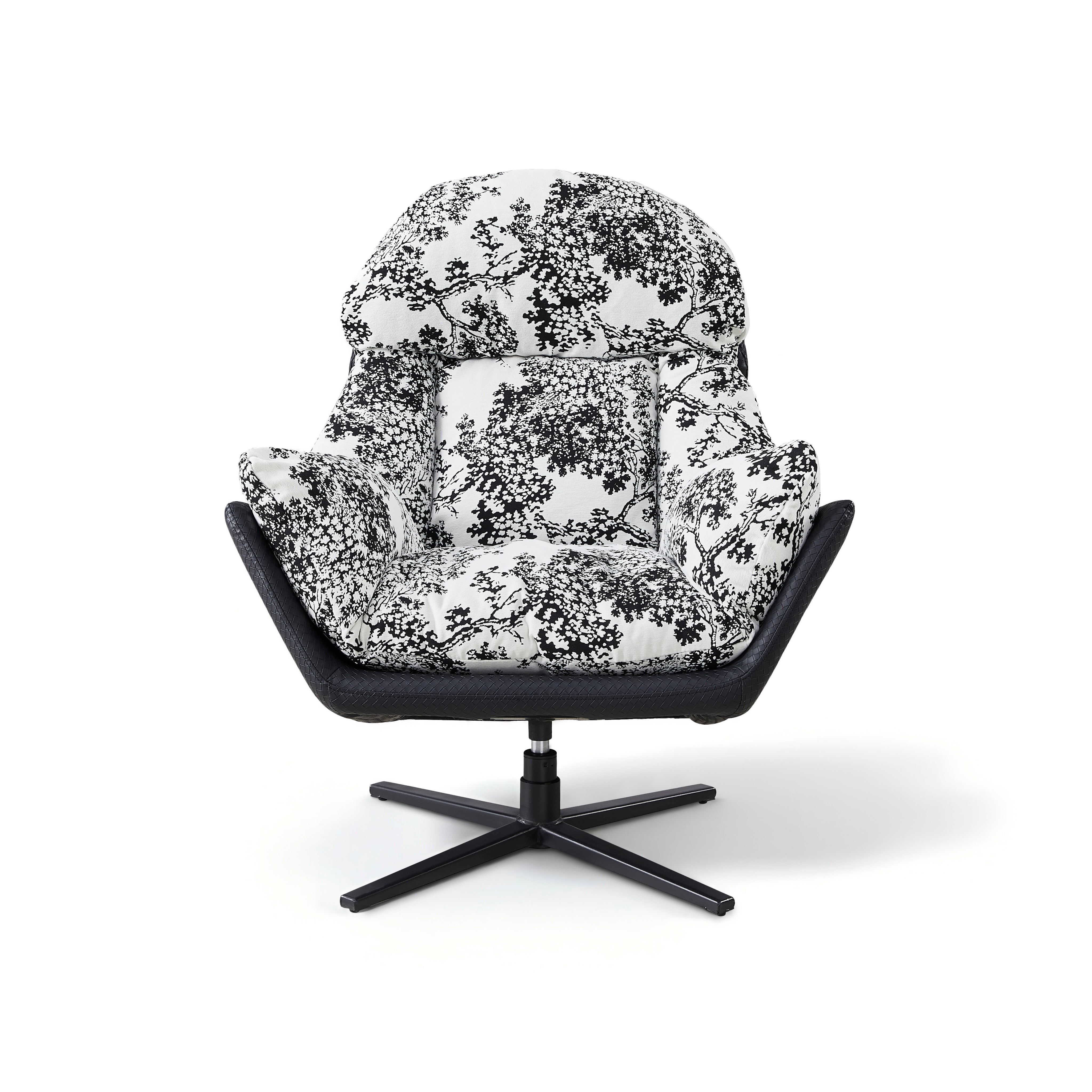 Ten wyjątkowy fotel wypoczynkowy to prawdziwe dzieło sztuki użytkowej, które odmieni każde wnętrze. Obicie wykonane z tkaniny premium w efektowny, czarno-biały wzór kwiatowy przyciąga wzrok i nadaje aranżacji niepowtarzalnego charakteru. Miękkie, puszyste wypełnienie oraz ergonomiczny kształt oparcia i podłokietników zapewniają niesamowitą wygodę, otulając użytkownika podczas odpoczynku. Całość spoczywa na solidnej, obrotowej podstawie ze stali malowanej proszkowo, która gwarantuje stabilność i swobodę ruchów, czyniąc ten mebel idealnym wyborem do salonu, sypialni czy stylowego kącika czytelniczego.