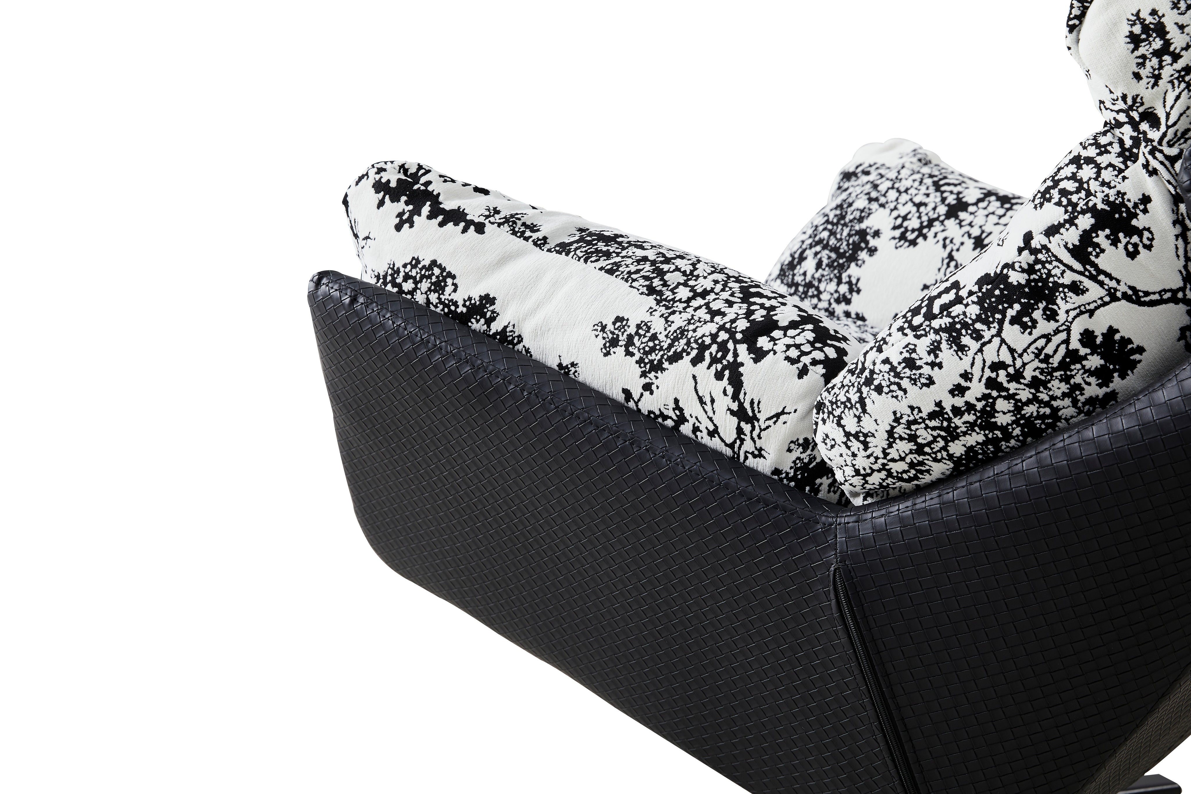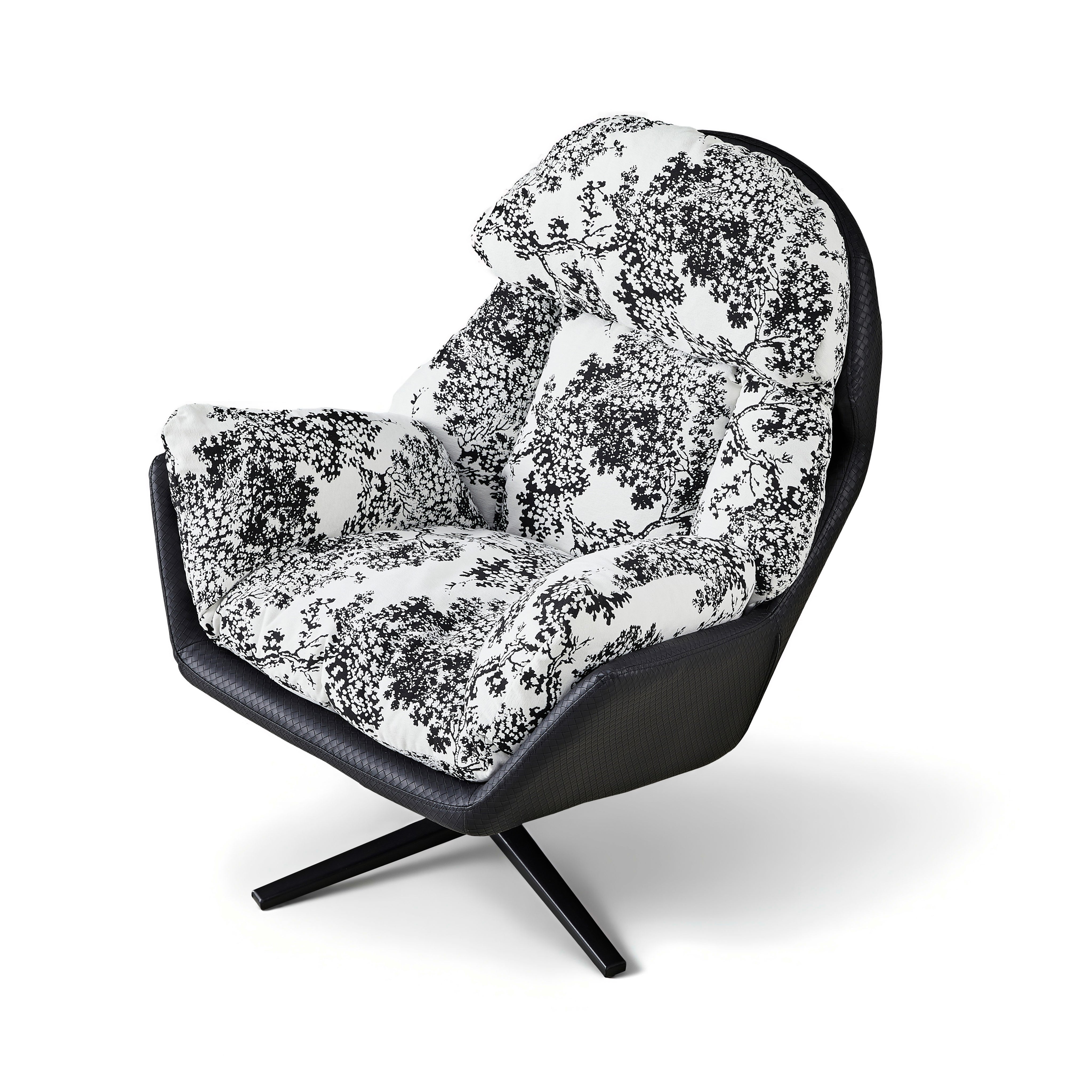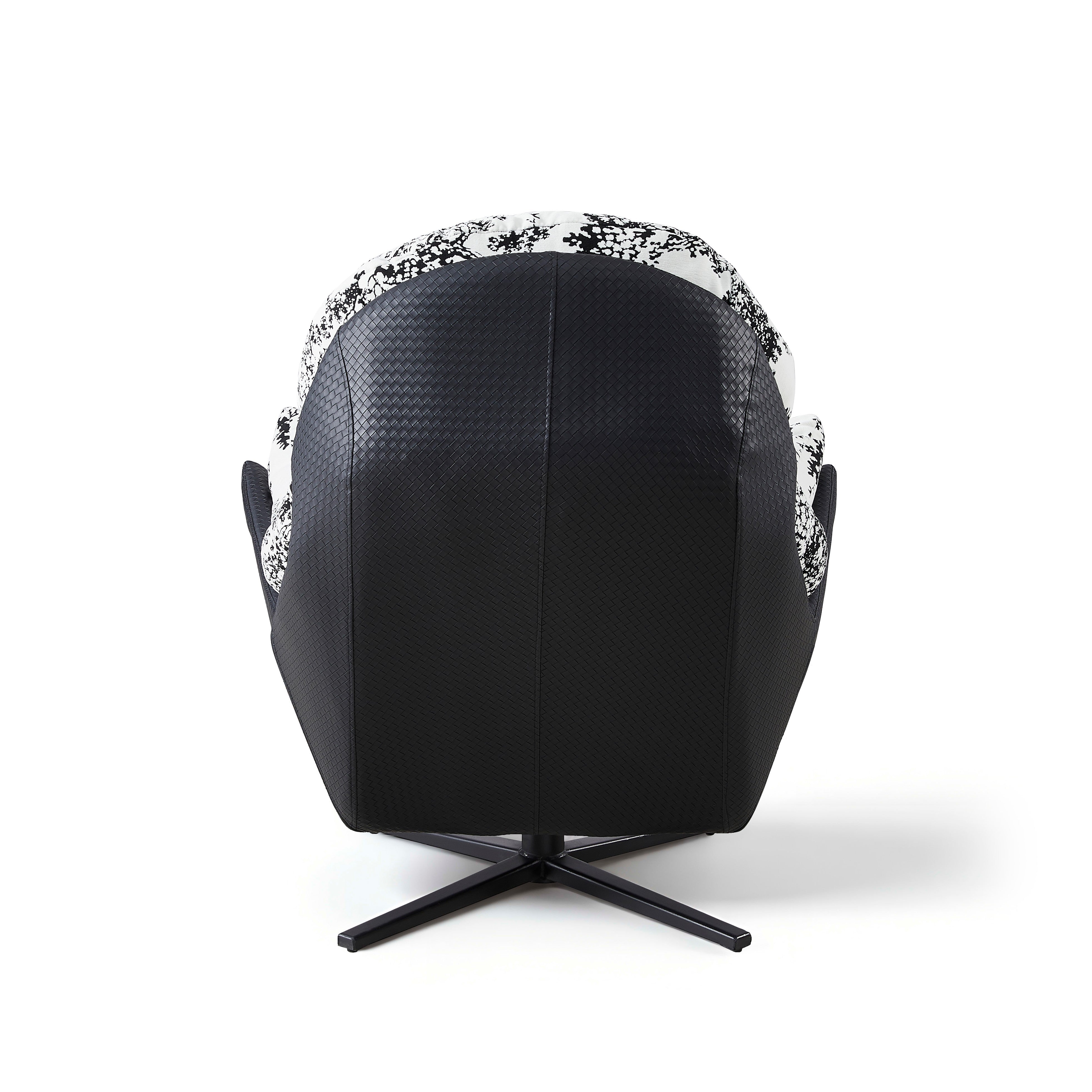 Ten wyjątkowy fotel wypoczynkowy to prawdziwe dzieło sztuki użytkowej, które odmieni każde wnętrze. Obicie wykonane z tkaniny premium w efektowny, czarno-biały wzór kwiatowy przyciąga wzrok i nadaje aranżacji niepowtarzalnego charakteru. Miękkie, puszyste wypełnienie oraz ergonomiczny kształt oparcia i podłokietników zapewniają niesamowitą wygodę, otulając użytkownika podczas odpoczynku. Całość spoczywa na solidnej, obrotowej podstawie ze stali malowanej proszkowo, która gwarantuje stabilność i swobodę ruchów, czyniąc ten mebel idealnym wyborem do salonu, sypialni czy stylowego kącika czytelniczego.