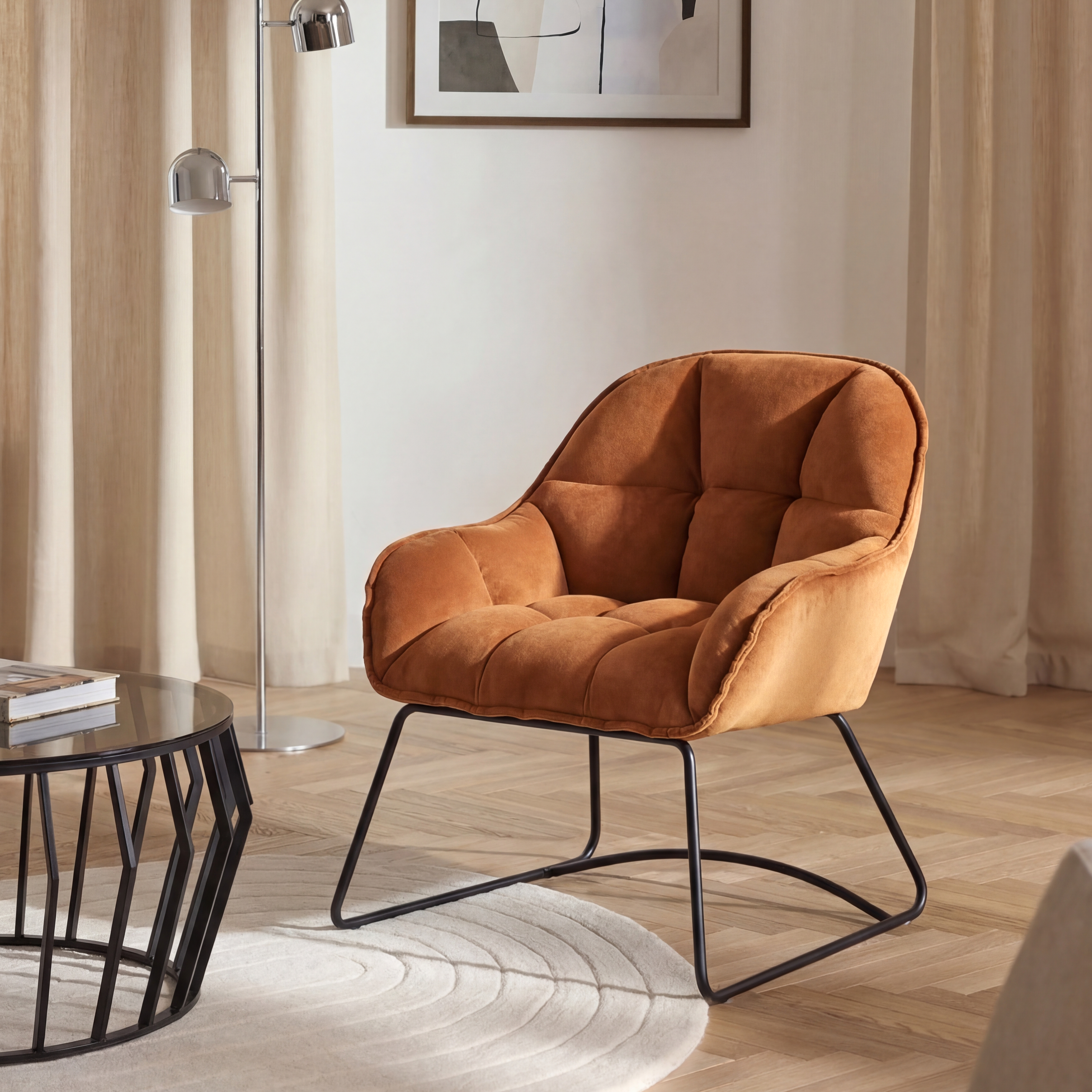 Ten pełen energii fotel wypoczynkowy w odcieniu soczystej pomarańczy stanowi wyrazisty akcent, który ożywi każde nowoczesne wnętrze. Wysokogatunkowa tkanina premium o miękkim splocie zapewnia nie tylko przyjemne wrażenia dotykowe, ale także wyjątkowy komfort użytkowania, zachęcając do chwil relaksu z książką czy kawą.