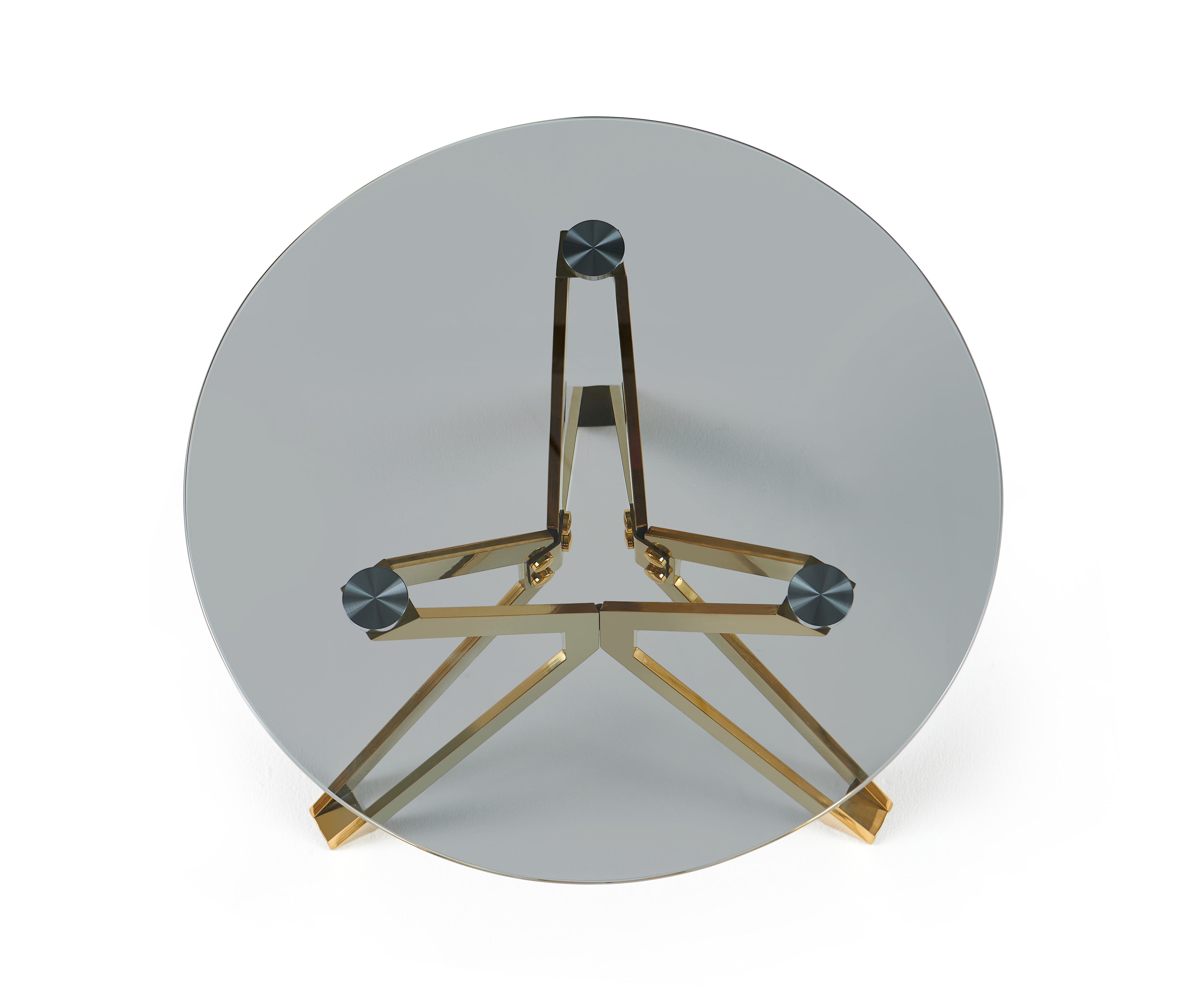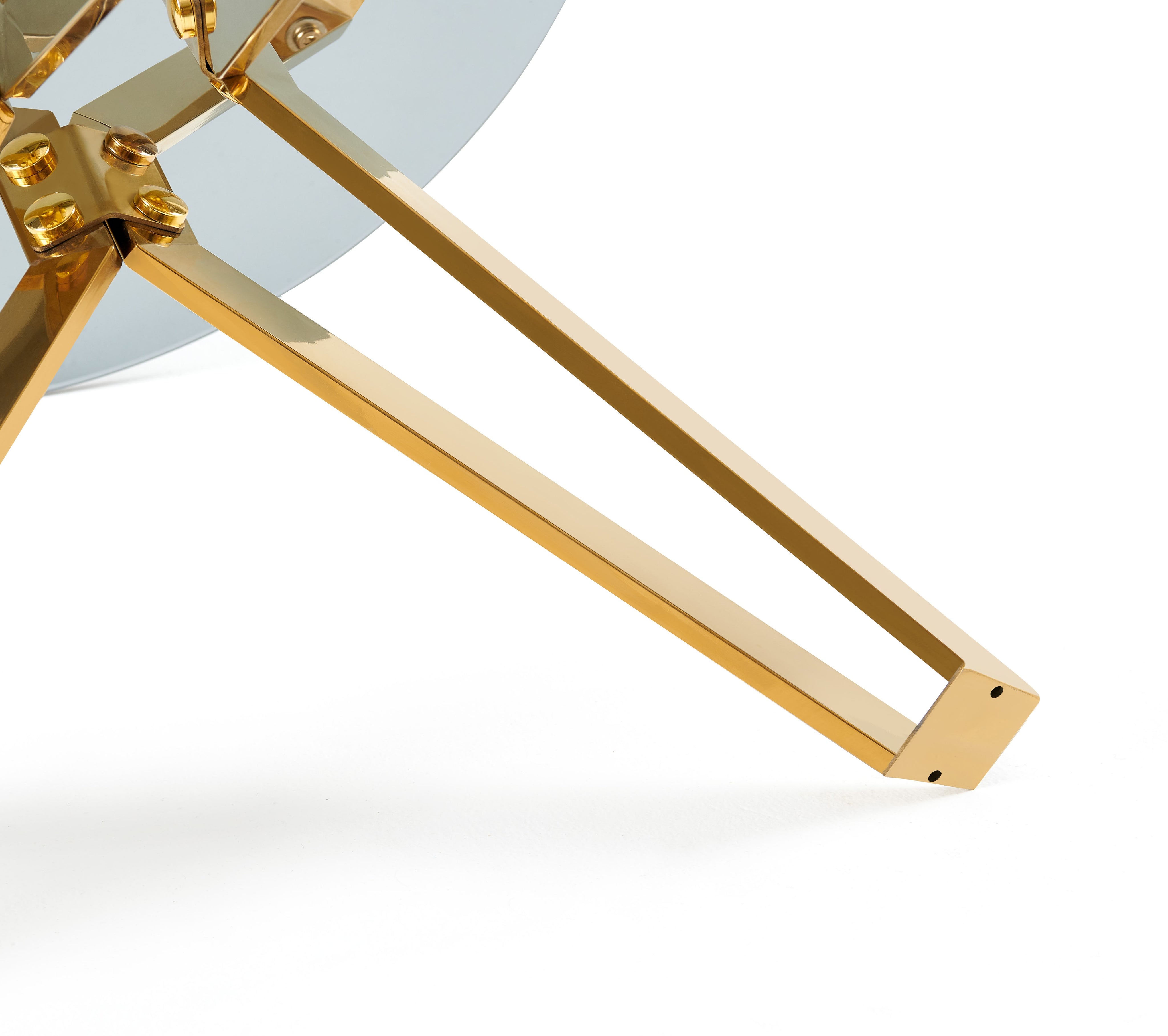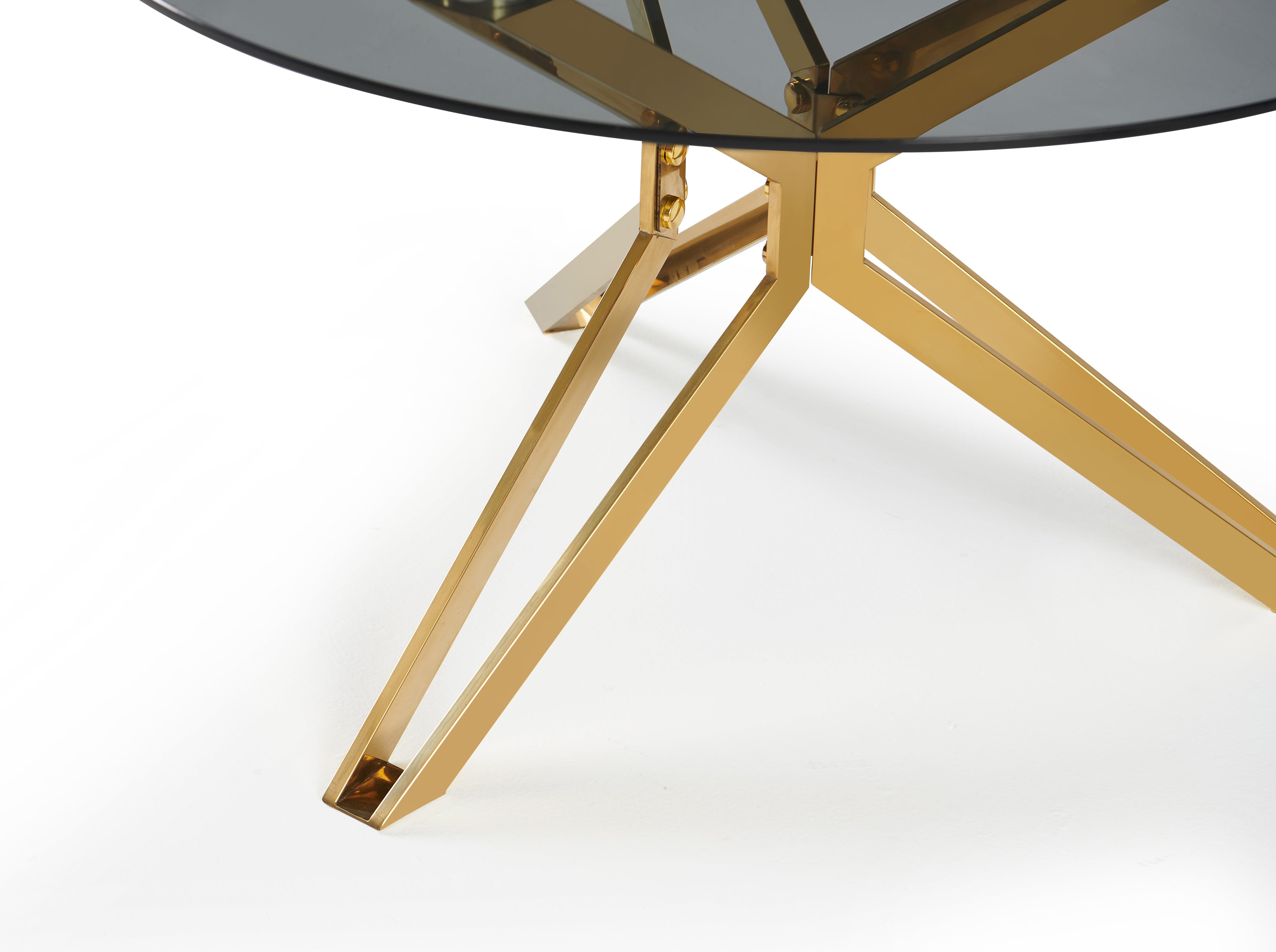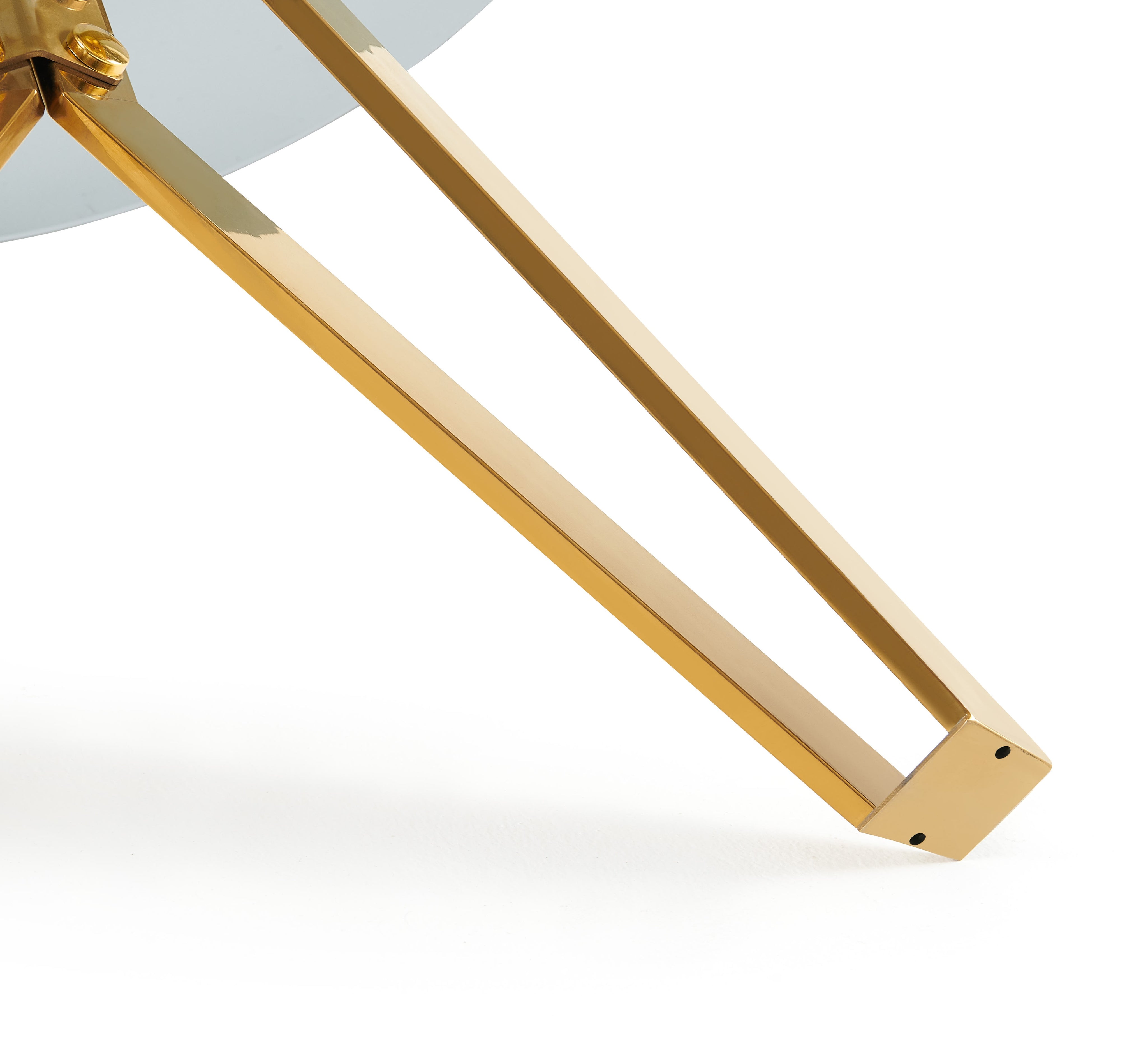 - Przezroczysta kolumna łącząca blat ze złotą metalową bazą