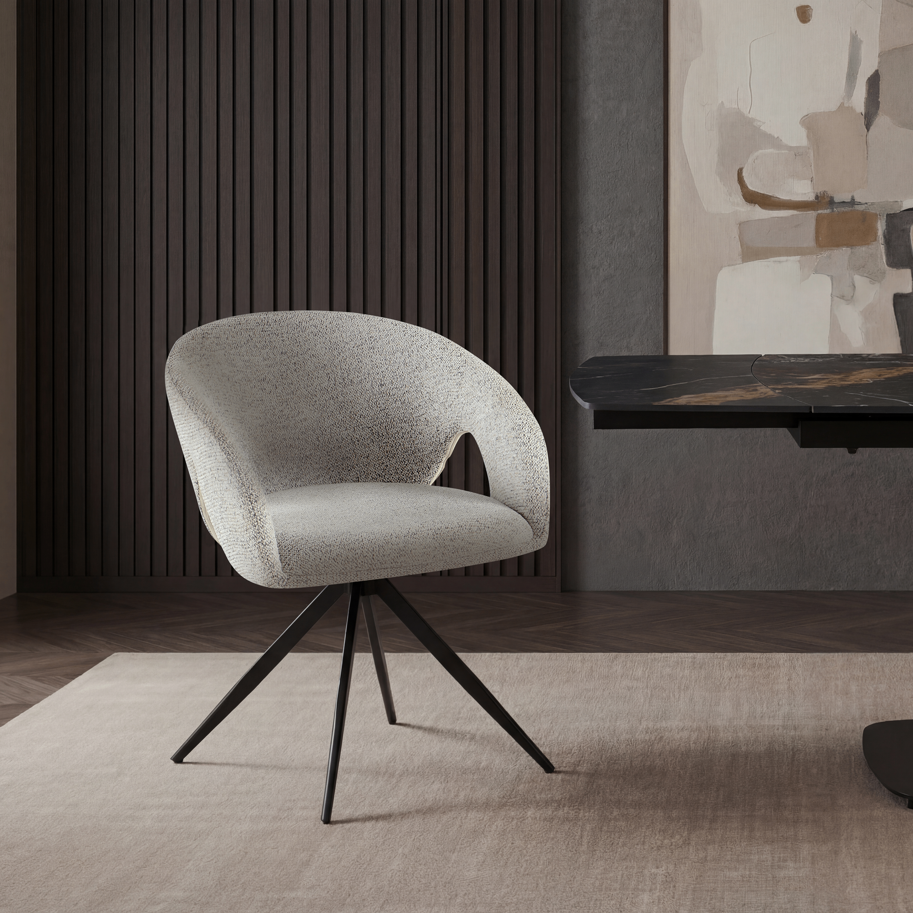 Krzesło Paris to synonim funkcjonalnego luksusu, który redefiniuje komfort w nowoczesnej jadalni. Wyposażone w praktyczny mechanizm obrotowy, zapewnia swobodę ruchów i wygodę, jakiej nie oferują tradycyjne krzesła. Tapicerka w eleganckim, kawowym odcieniu ociepla wnętrze, nadając mu przytulnego, a zarazem wyrafinowanego charakteru. Całość osadzona jest na solidnych, czarnych nogach stalowych o geometrycznym kształcie, które gwarantują stabilność i wprowadzają do aranżacji nutę industrialnego stylu. To idealny wybór dla osób ceniących połączenie ergonomii z niebanalnym designem, doskonale sprawdzający się zarówno w jadalni, jak i w domowym biurze.