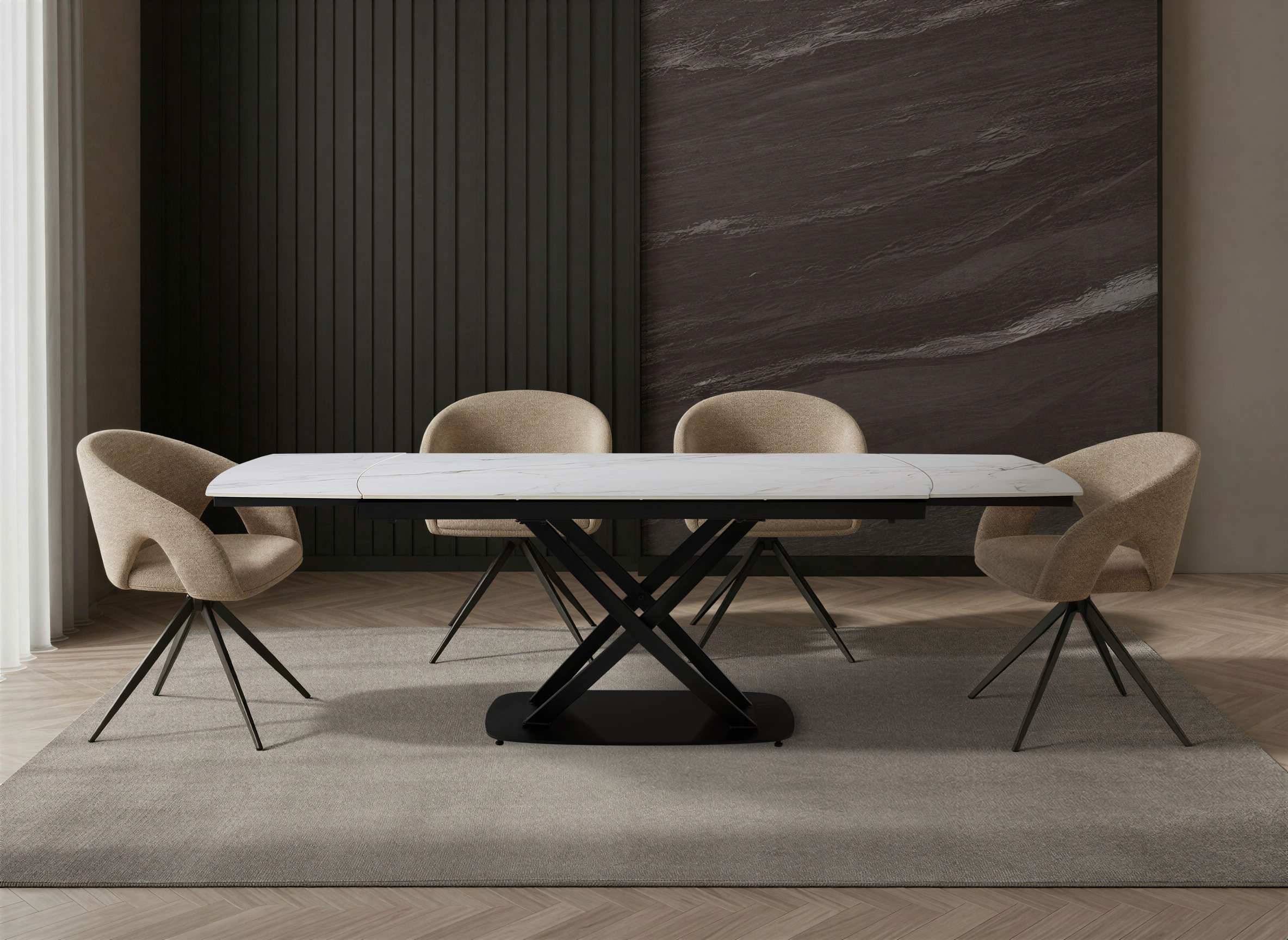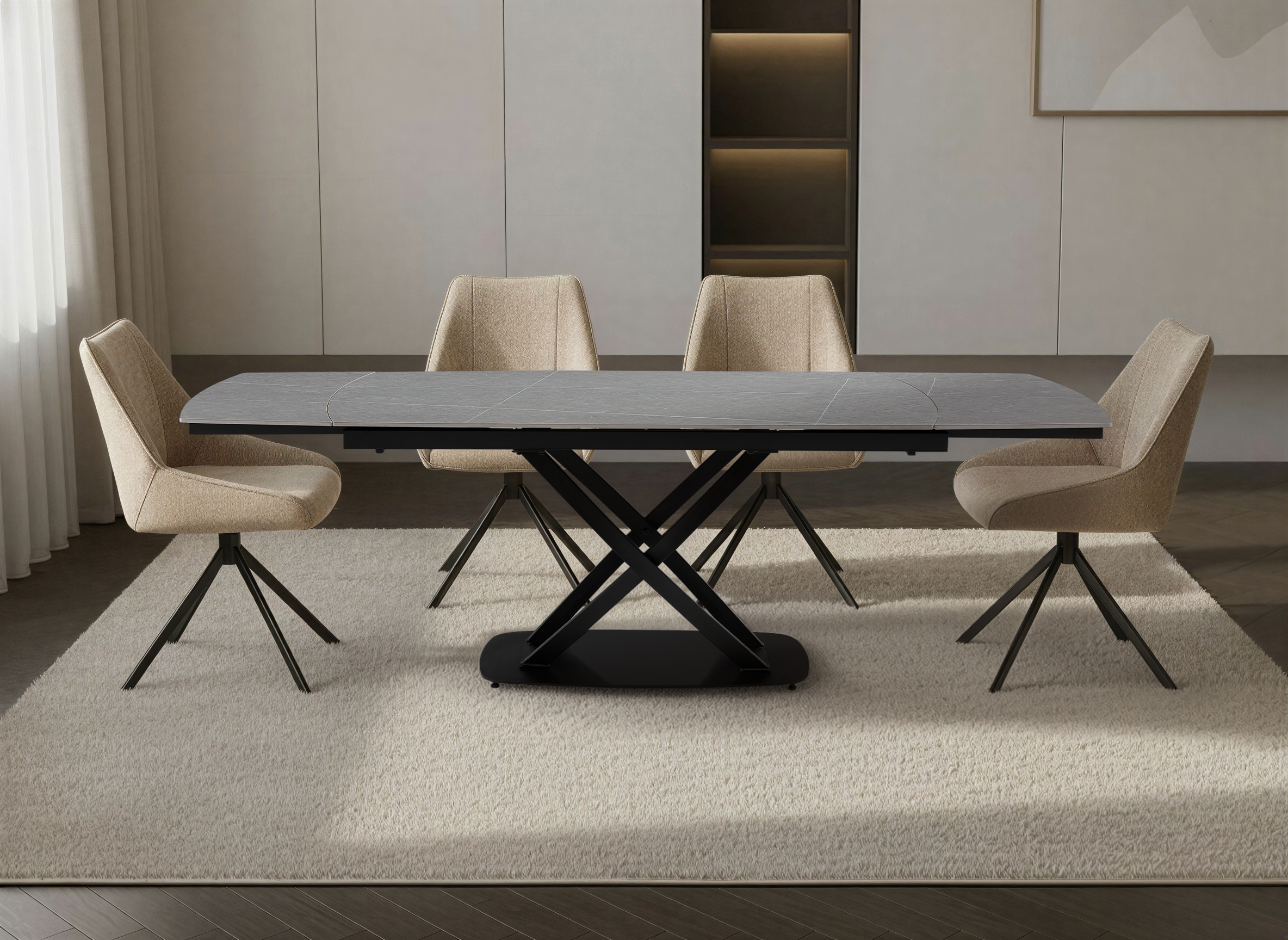 Stylowy stół ceramiczny do jadalni łączy eleganckie wzornictwo z wyjątkową funkcjonalnością. Dzięki mechanizmowi rozkładania blat można łatwo wydłużyć z 160 cm do 240 cm, co zapewnia komfort podczas codziennych posiłków oraz większych spotkań rodzinnych.