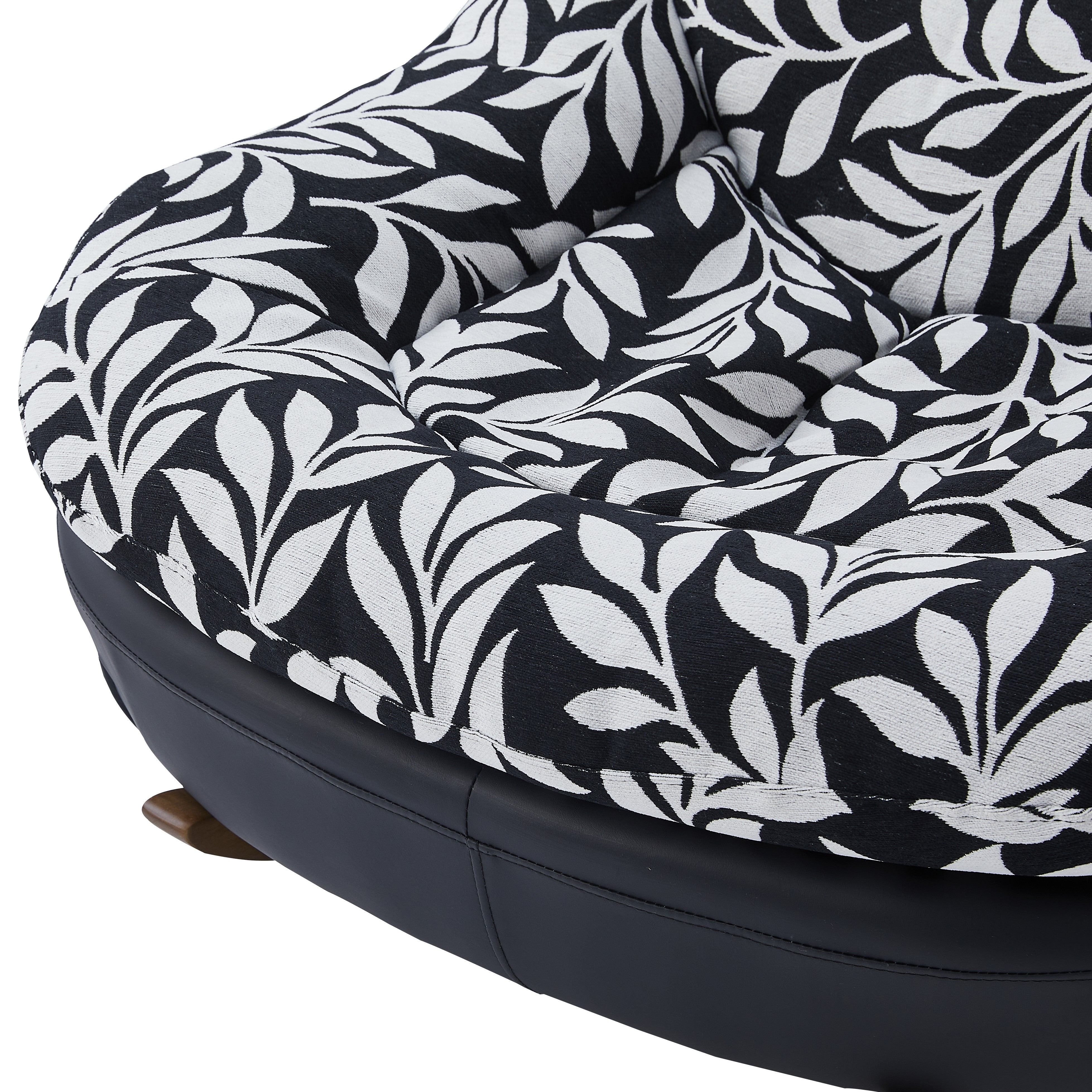 Fotel bujany Parma w efektowny wzór liści to unikalne połączenie natury i nowoczesnego designu, które zamieni każde wnętrze w oazę spokoju. Tapicerowany wysokogatunkową tkaniną w czarnym kolorze z wyrazistym, białym motywem botanicznym, przyciąga wzrok i stanowi oryginalny akcent dekoracyjny w salonie czy sypialni.