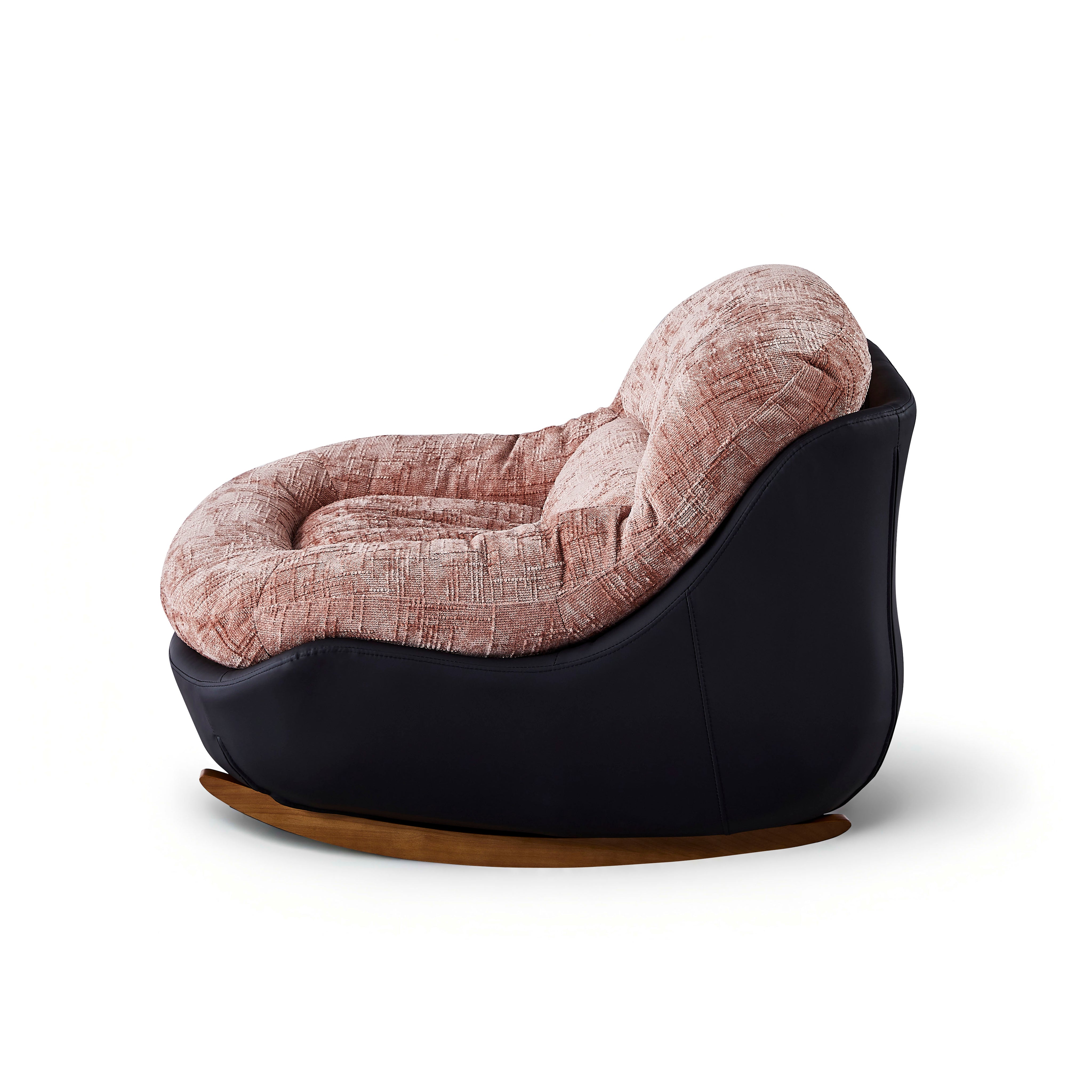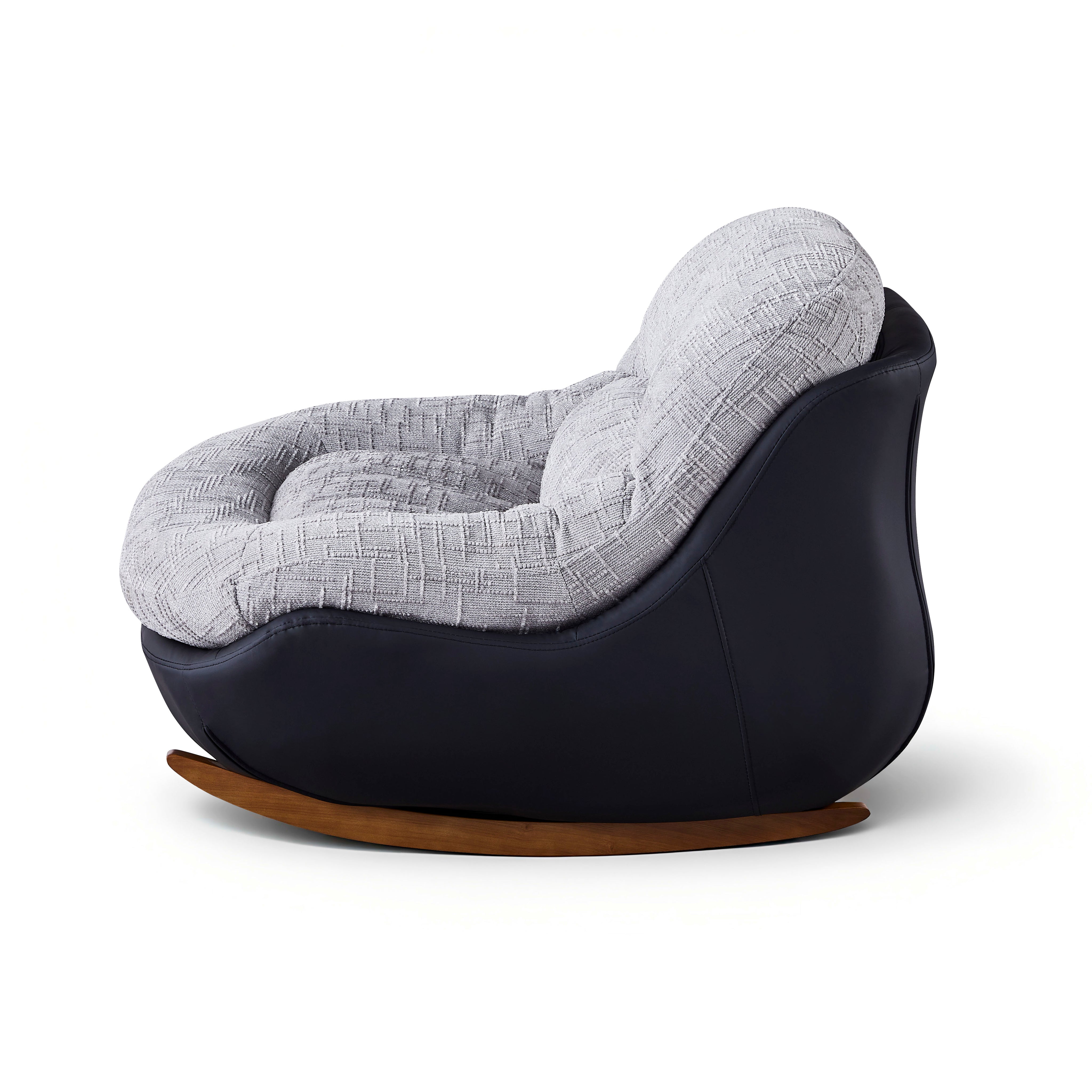 Jego obszerna, otulająca forma zapewnia poczucie bezpieczeństwa i intymności, a funkcja delikatnego kołysania pozwala na głęboki relaks po dniu pełnym wrażeń. Solidna konstrukcja osadzona na drewnianych płozach gwarantuje płynny ruch i stabilność, czyniąc ten mebel idealnym wyborem dla osób ceniących niebanalny styl i wygodę.