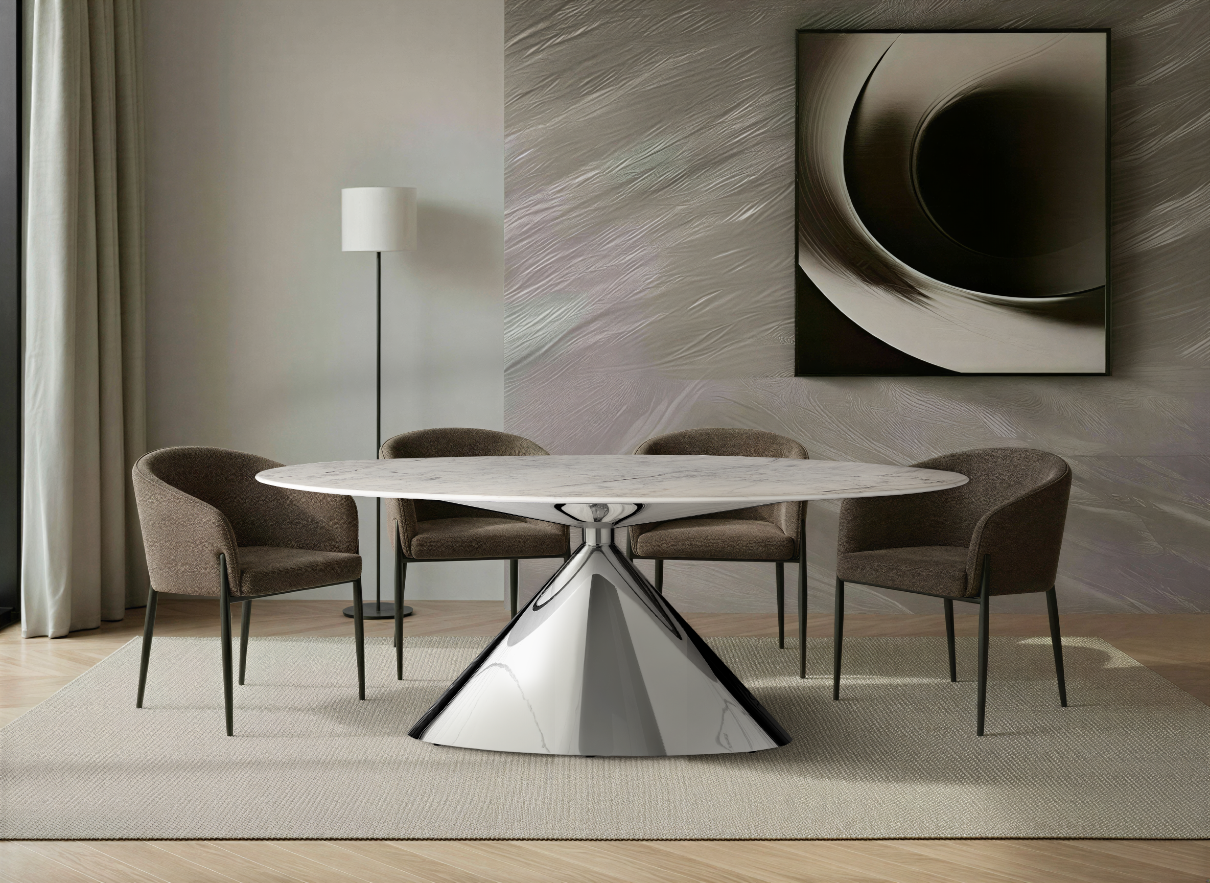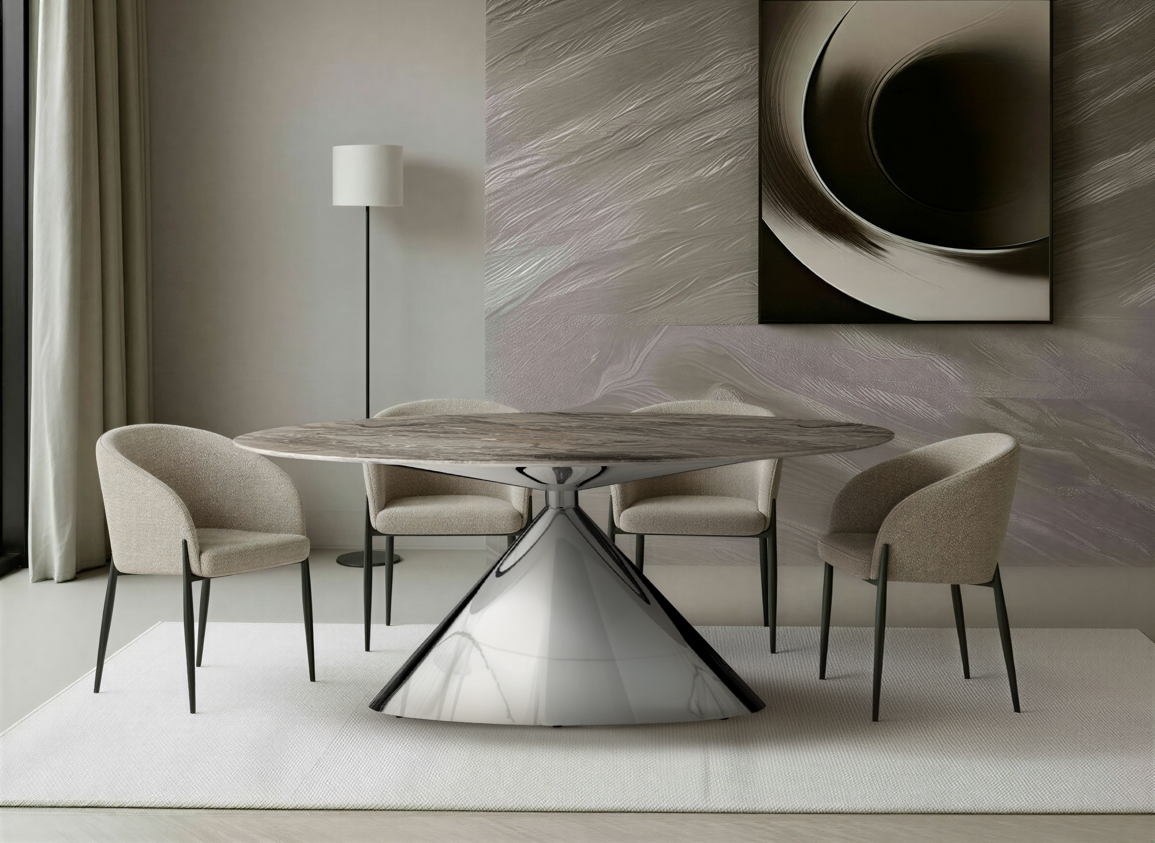 Stół jadalniany Soft to elegancki mebel wykonany z naturalnego brązowego kamienia. Owalny blat prezentuje wyrazisty układ żył, który podkreśla unikalność każdego egzemplarza. Naturalny kamień zapewnia odporność na zarysowania, wysoką temperaturę oraz łatwość utrzymania w czystości. Podstawa trójkątna z polerowanej stali nierdzewnej (inox) nadaje nowoczesny wygląd i gwarantuje stabilność.