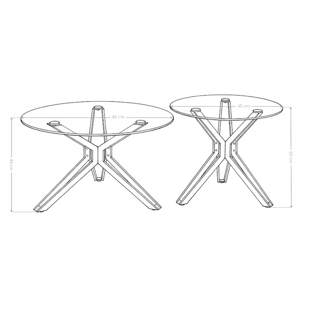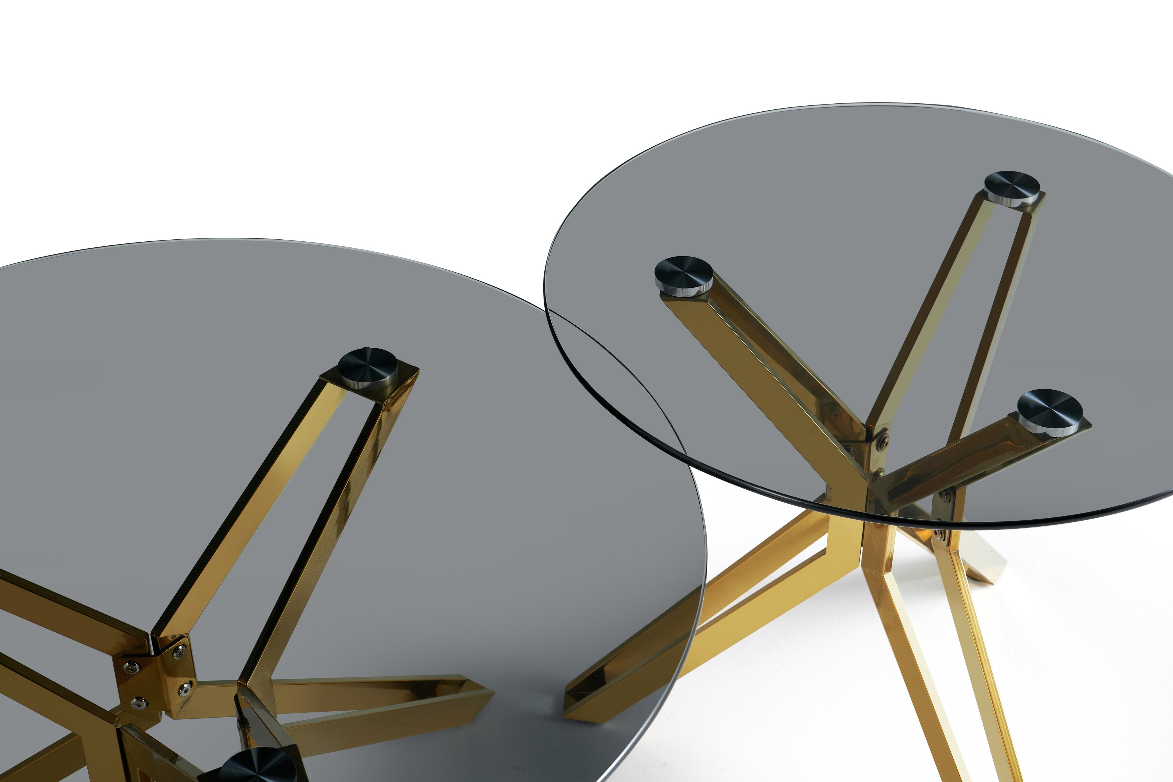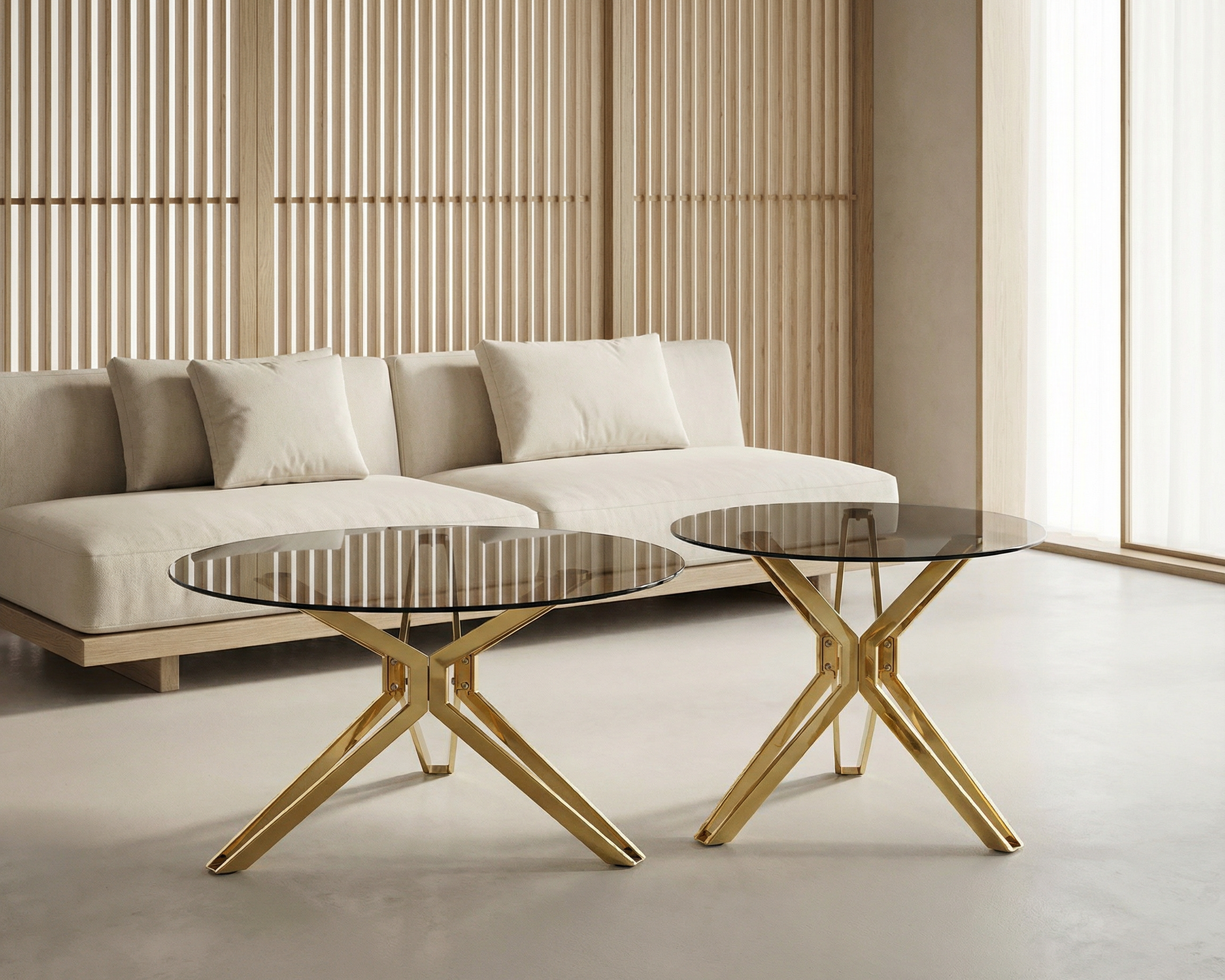 Zestaw stolików kawowych BALANCE to elegancka propozycja składająca się z dwóch okrągłych stolików o różnych średnicach i wysokościach, tworzących spójną i funkcjonalną całość. Połączenie czarnych blatów ze szkła hartowanego z metalowym stelażem w złotym wykończeniu nadaje zestawowi nowoczesny i luksusowy charakter.