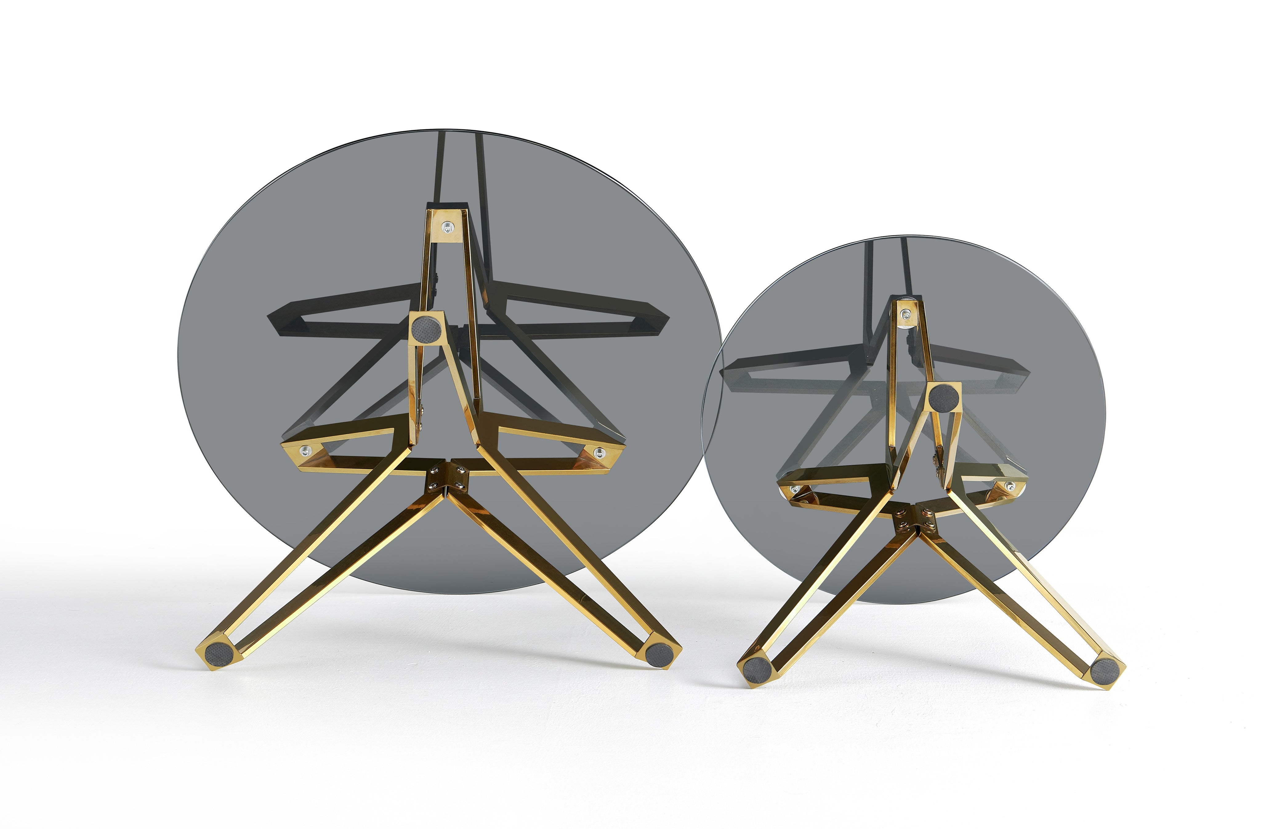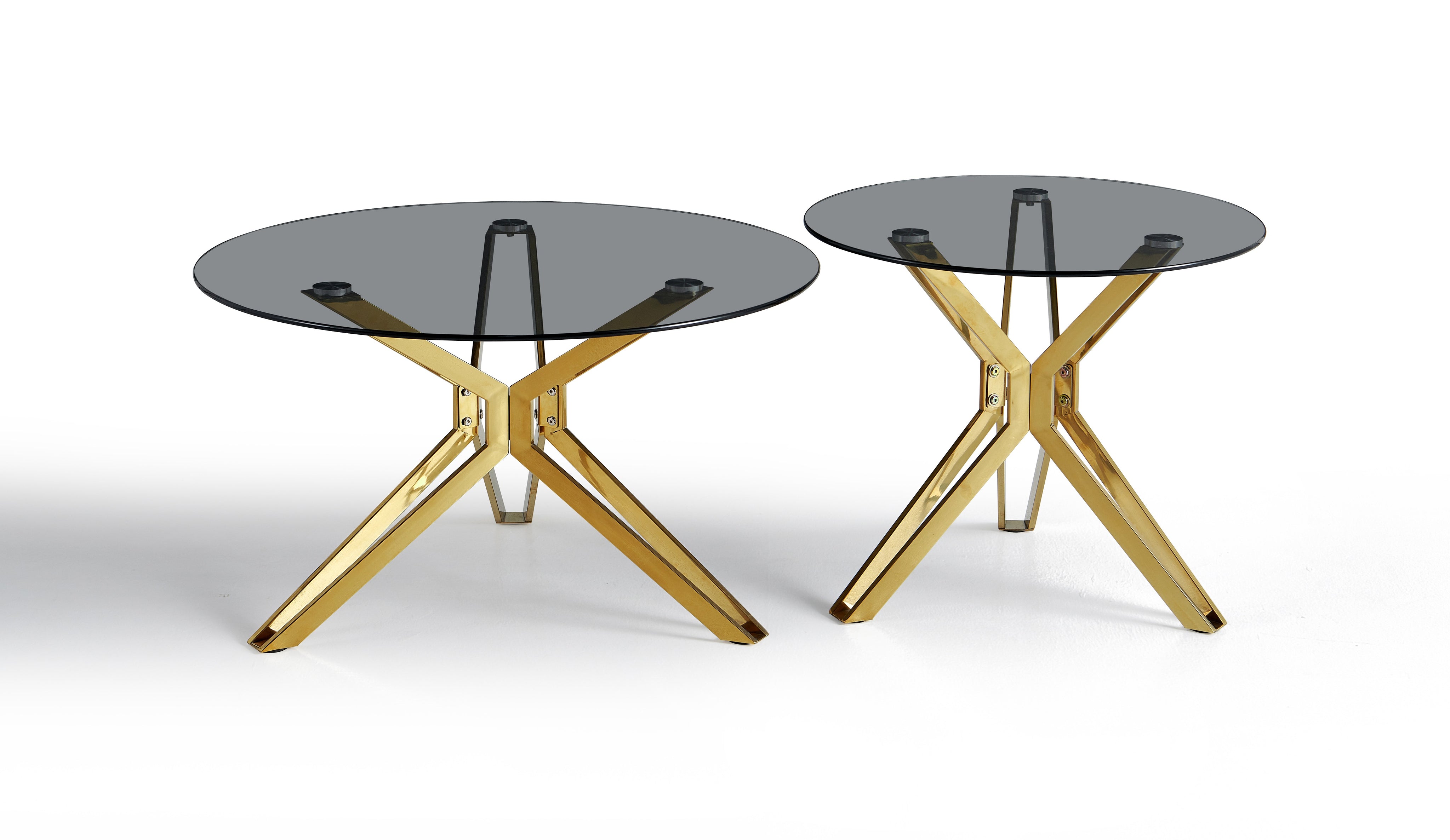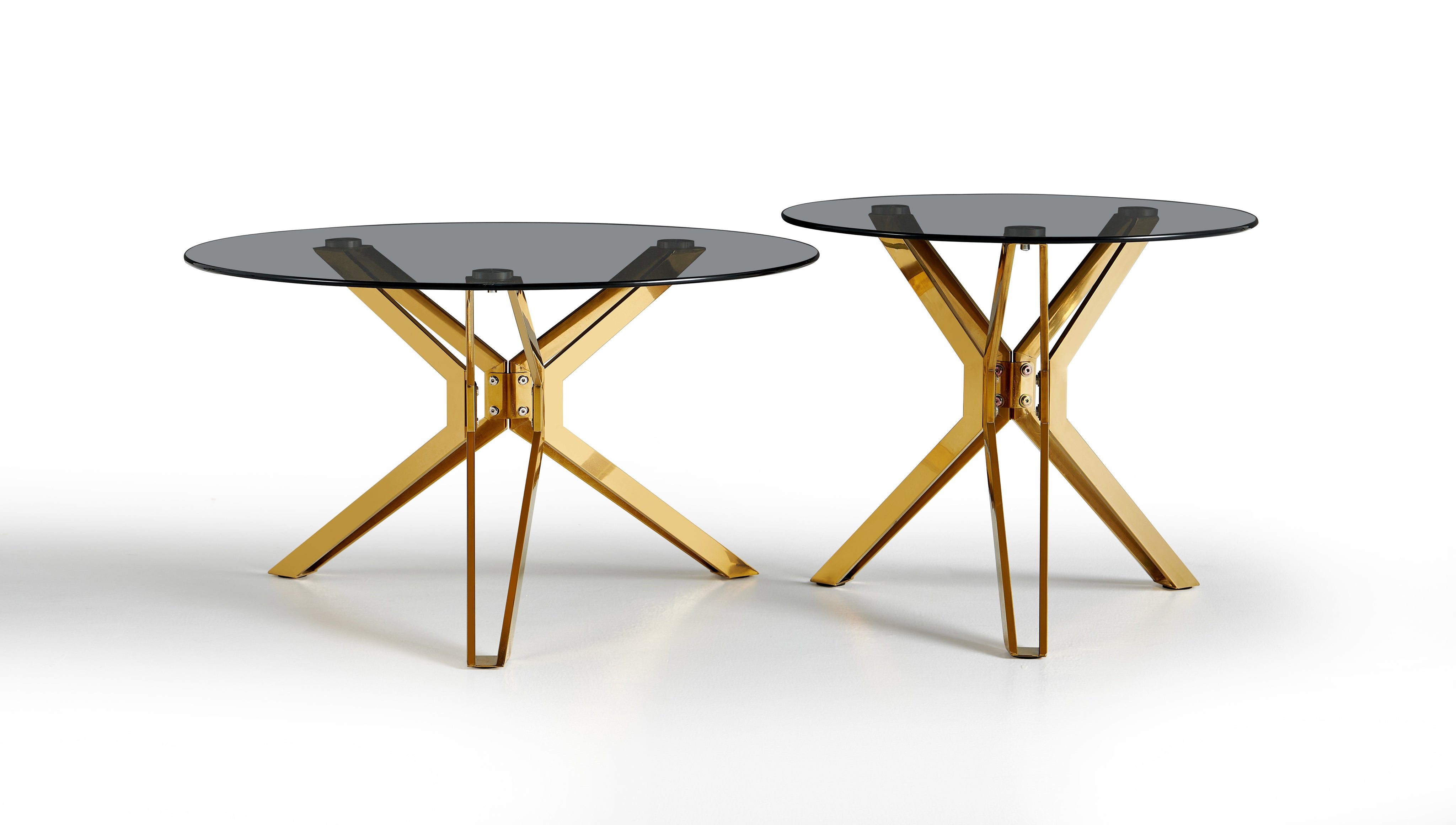Zestaw stolików kawowych BALANCE to elegancka propozycja składająca się z dwóch okrągłych stolików o różnych średnicach i wysokościach, tworzących spójną i funkcjonalną całość. Połączenie czarnych blatów ze szkła hartowanego z metalowym stelażem w złotym wykończeniu nadaje zestawowi nowoczesny i luksusowy charakter.