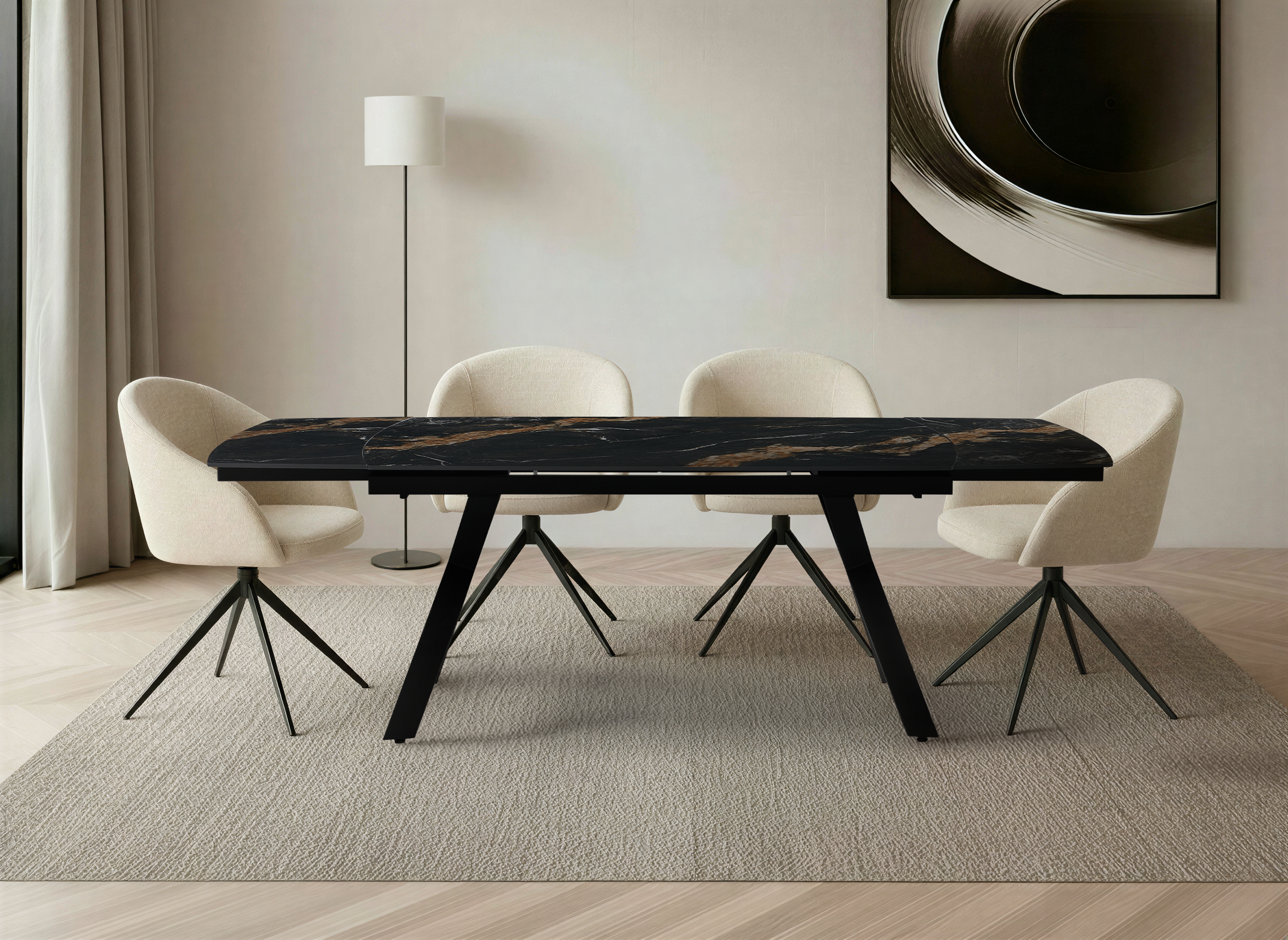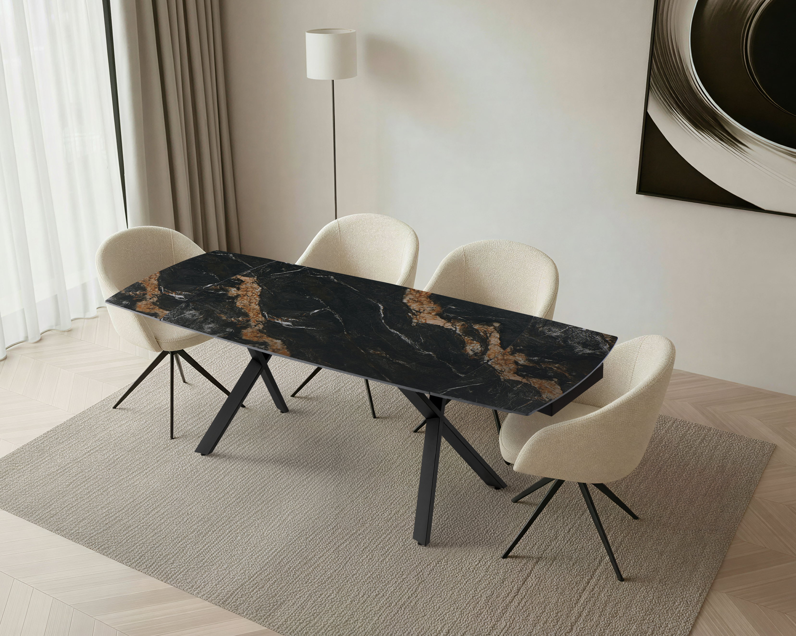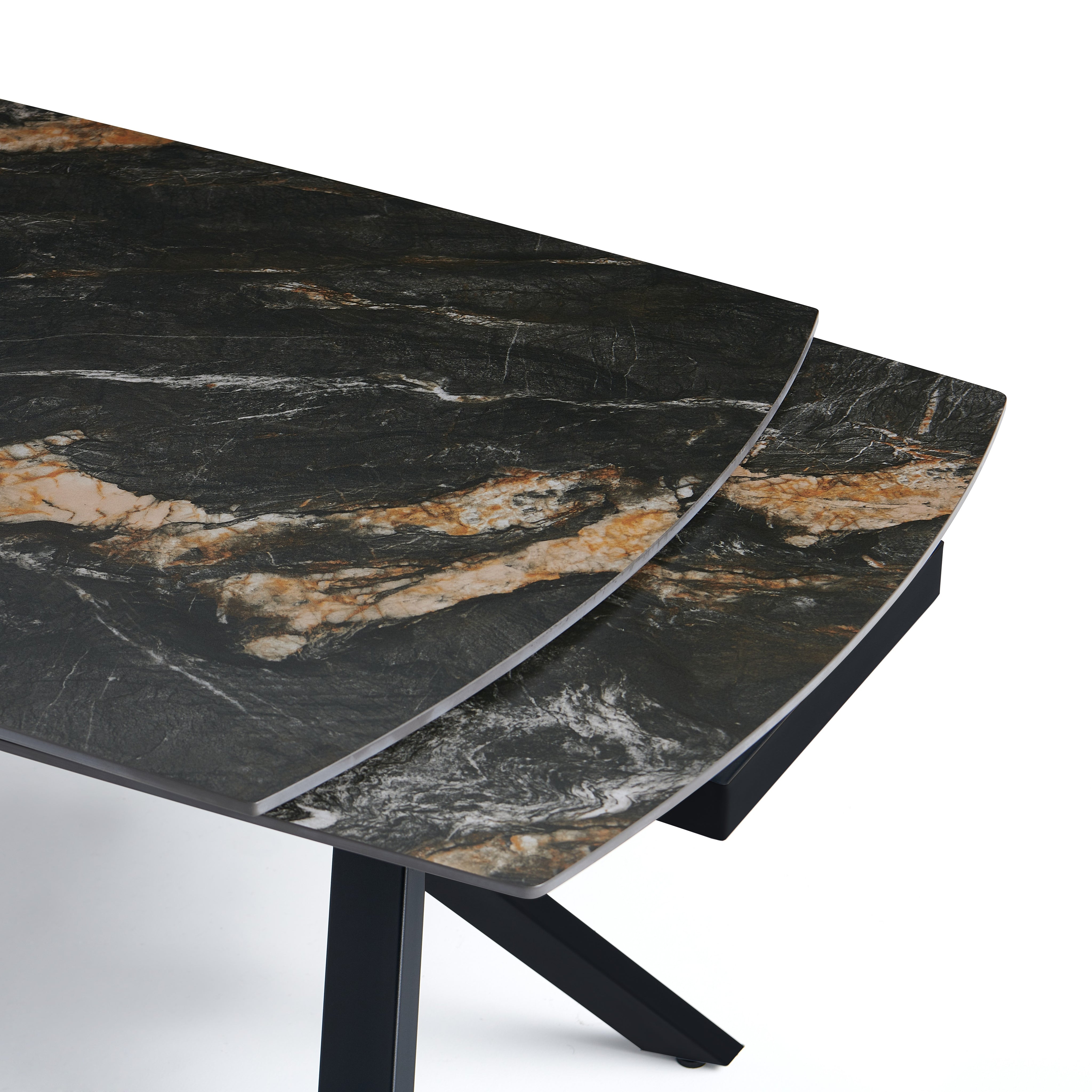 Blat ceramiczny w kolorze marmuru czarnego charakteryzuje się wysoką odpornością na zarysowania, temperaturę i zabrudzenia, dzięki czemu idealnie sprawdza się w intensywnym użytkowaniu. Stabilne nogi ze stali malowanej proszkowo na czarno gwarantują wytrzymałość i estetyczny wygląd.