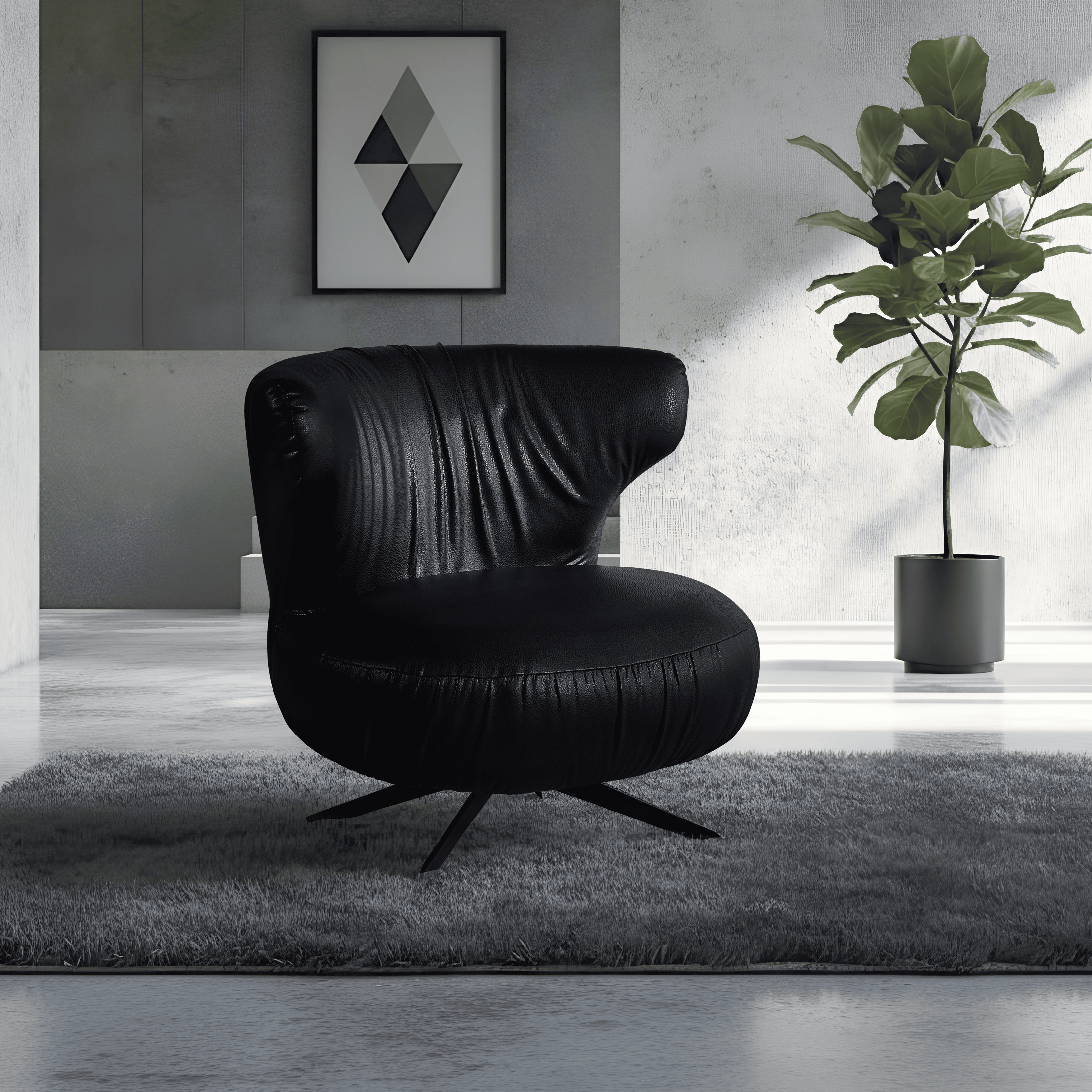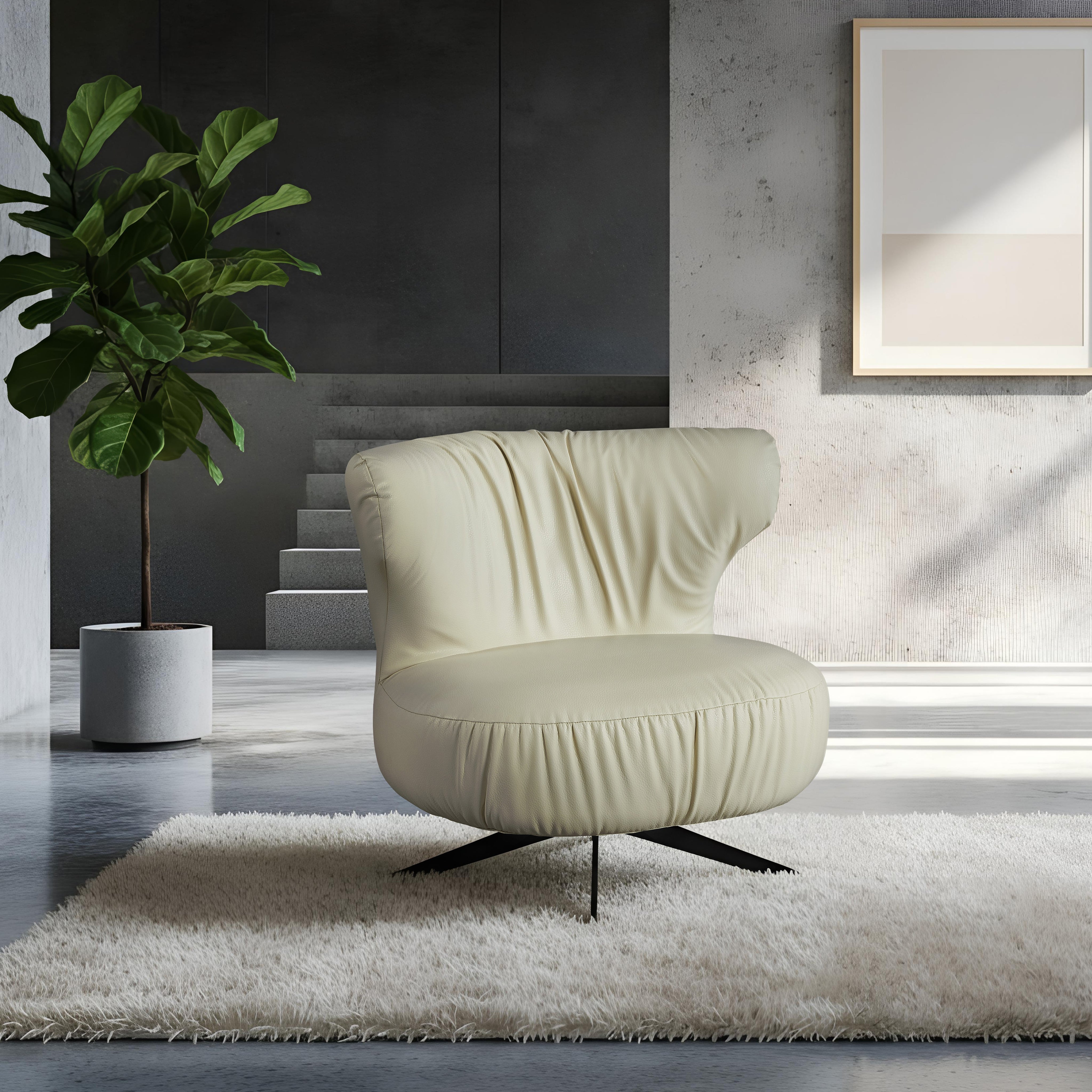 Ten luksusowy fotel wypoczynkowy łączy w sobie unikalny design z niepowtarzalnym komfortem użytkowania. Obicie wykonane z wysokogatunkowej skóry ekologicznej w subtelnym, kremowym odcieniu nadaje wnętrzu lekkości i elegancji, a jednocześnie jest niezwykle proste w pielęgnacji. Miękka, puszysta forma siedziska i oparcia, przypominająca chmurkę, zachęca do odpoczynku, oferując doskonałe podparcie dla całego ciała. Całość osadzona jest na solidnej, stalowej podstawie malowanej proszkowo, która zapewnia stabilność i podkreśla nowoczesny charakter mebla. To idealny wybór do stylowego salonu, przestronnej sypialni czy designerskiego gabinetu, gdzie stanie się ulubionym miejscem relaksu.