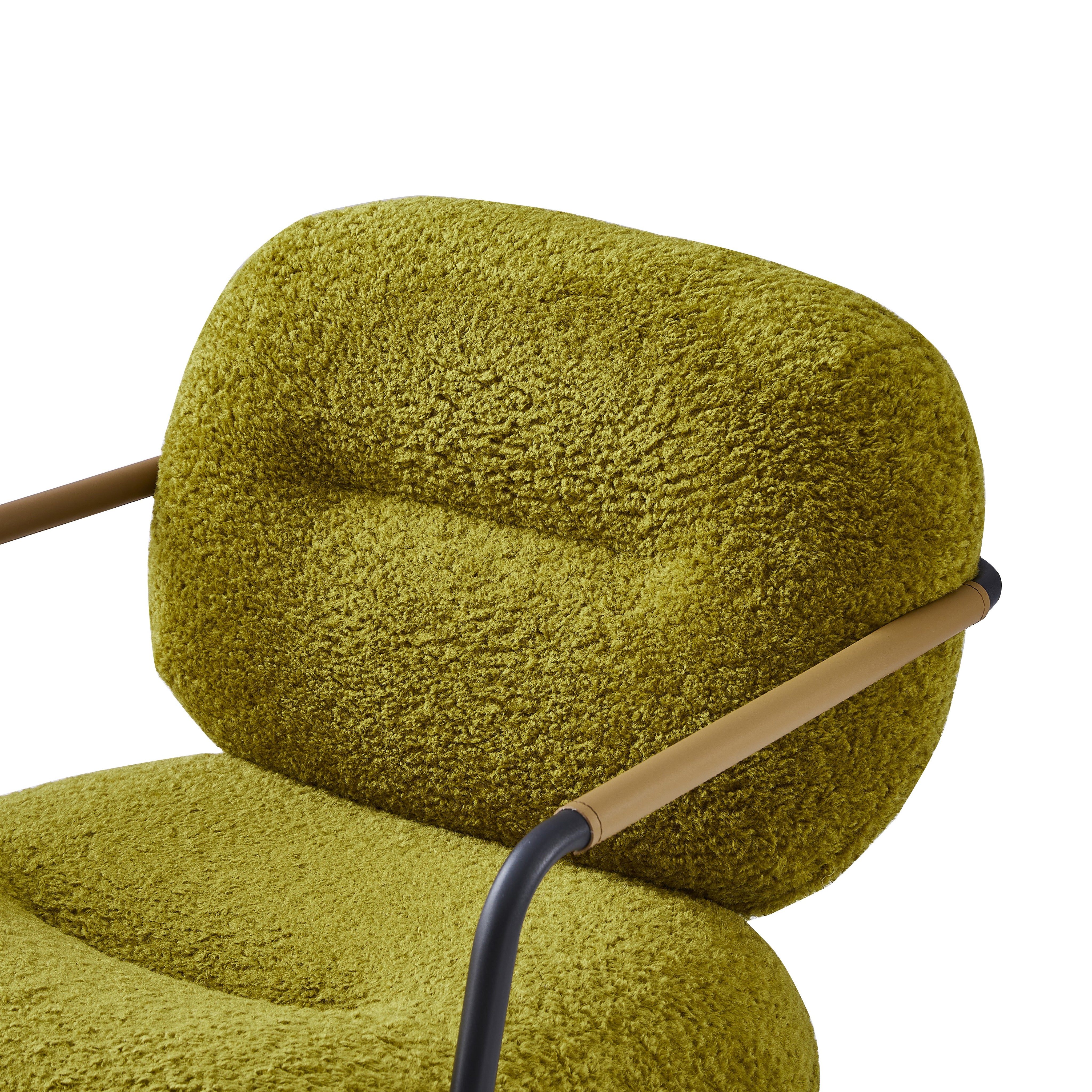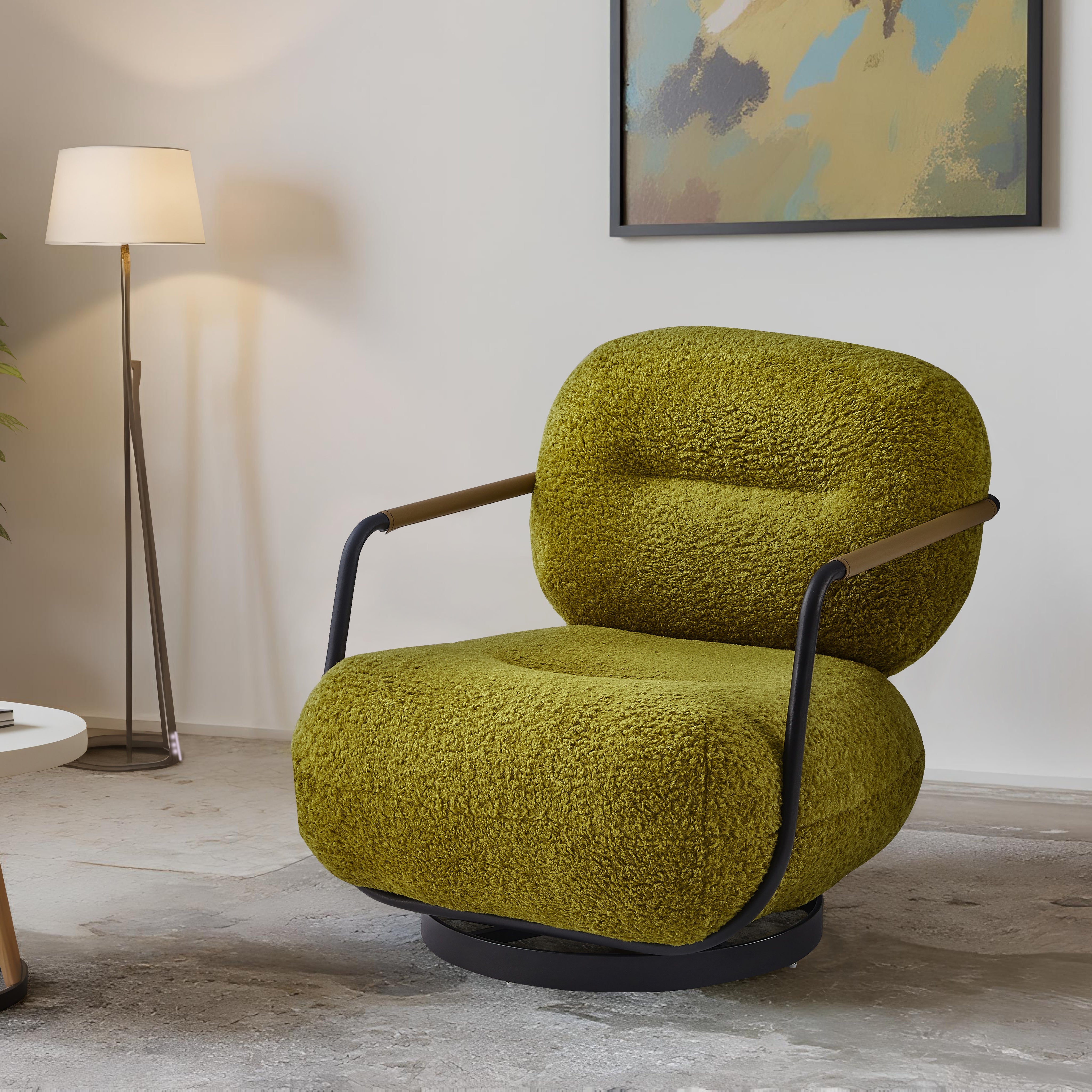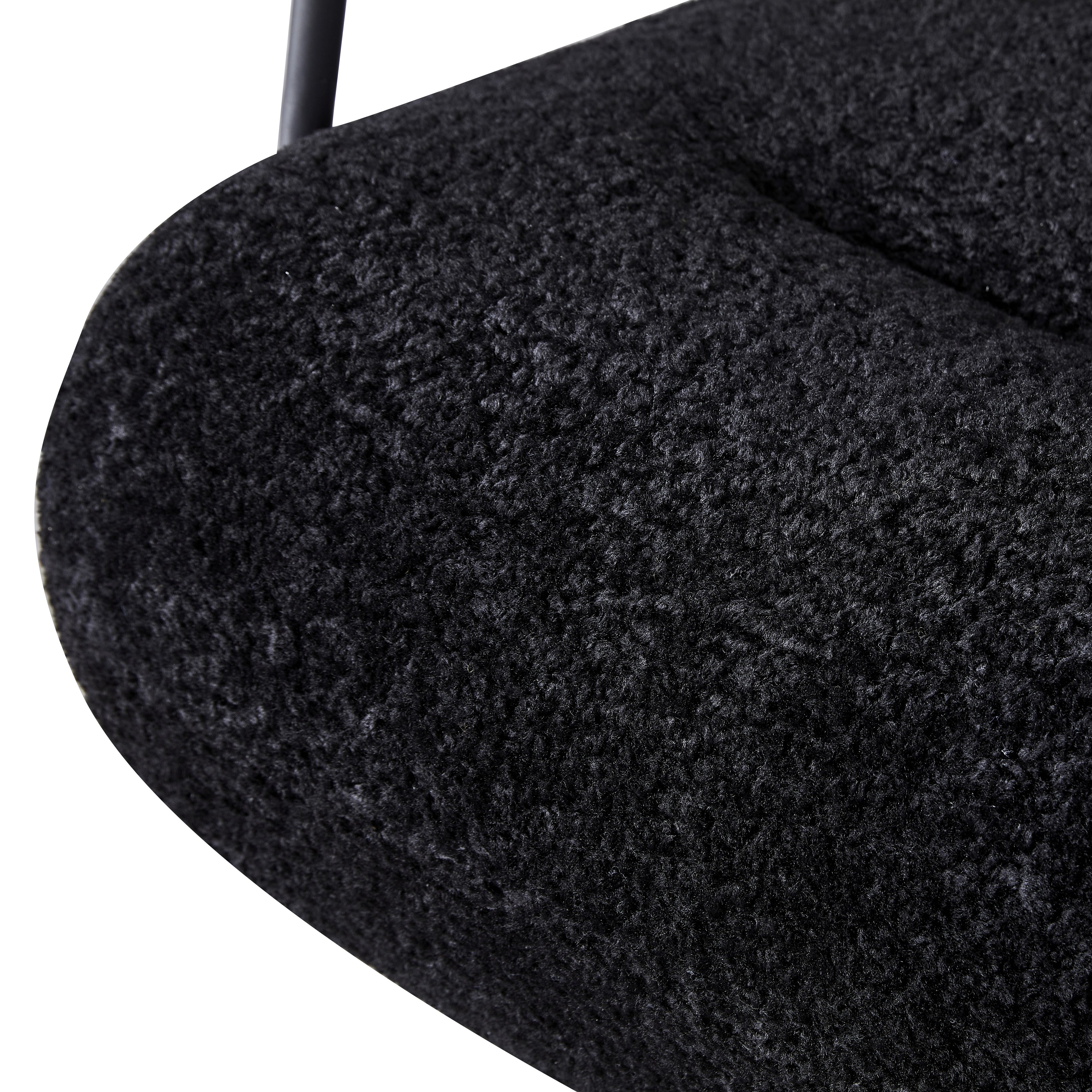 Siedzisko oraz oparcie zostały tapicerowane tkaniną bouclé w kolorze czarnym. Strukturalna powierzchnia materiału nadaje fotelowi nowoczesny, wyrazisty wygląd i doskonale wpisuje się w aranżacje minimalistyczne oraz współczesne wnętrza.